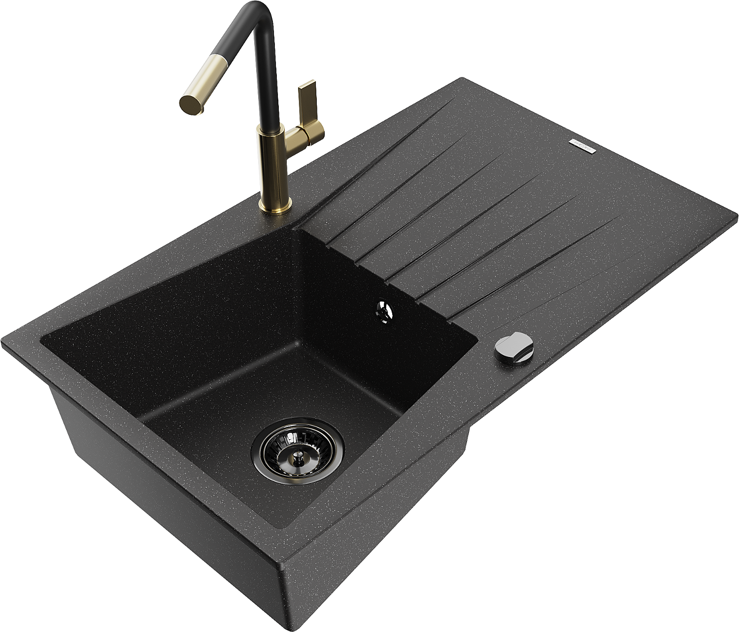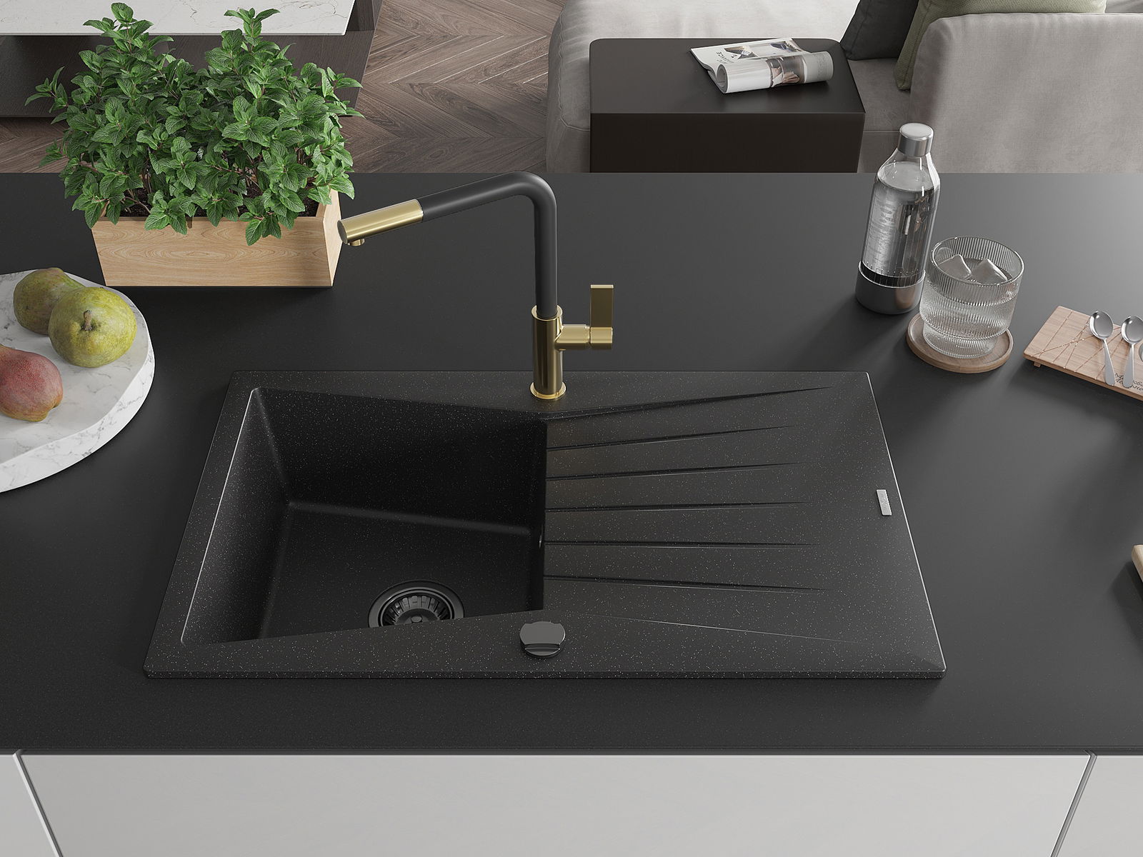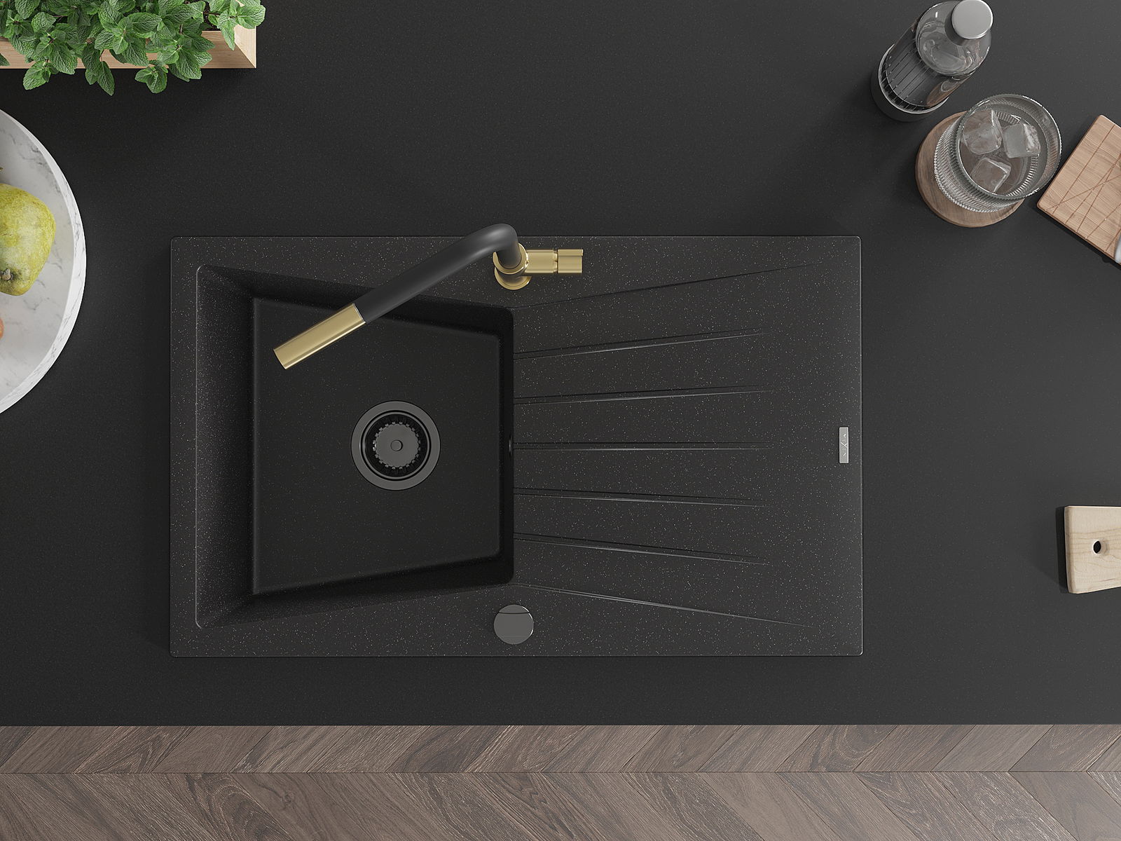 Mexen Cesar vienos kameros granito kriauklė su nutekėjimo plokšte ir virtuviniu maišytuvu Flora, juoda/sidabrinis metalikas
