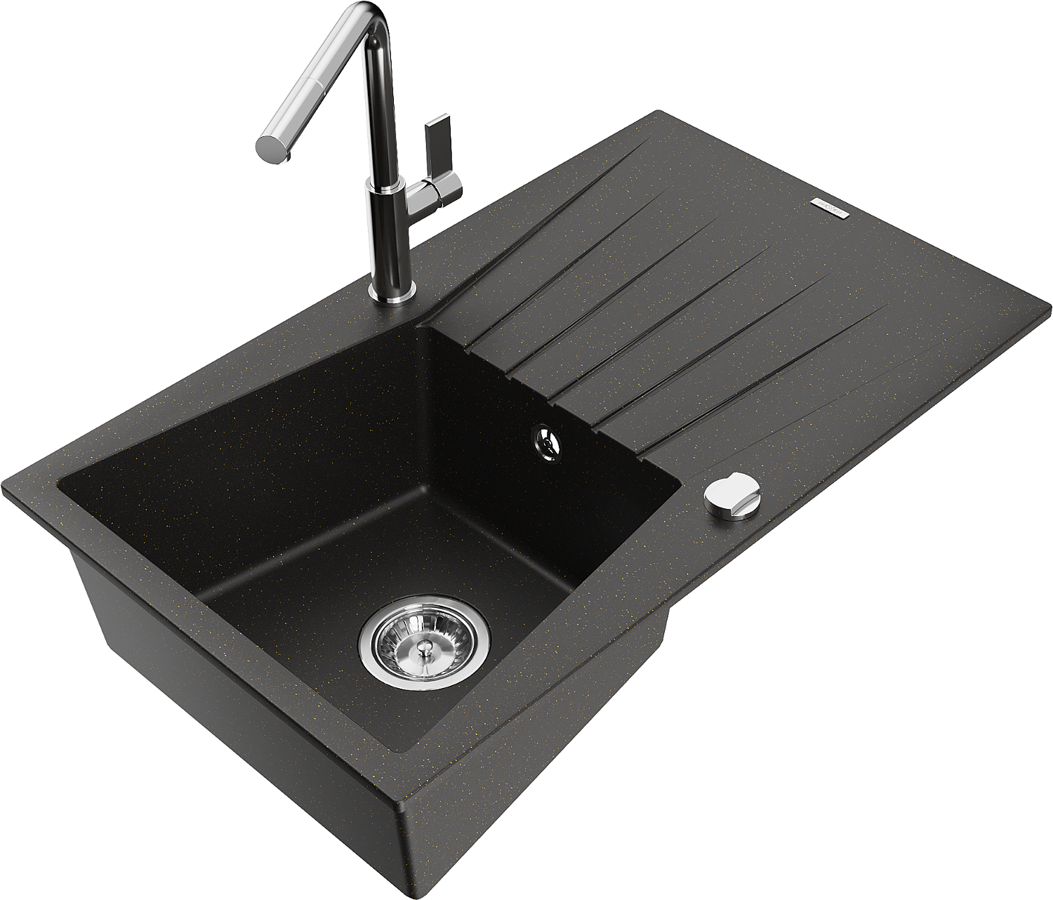 Mexen Cesar granitinis virtuvės plautuvas su viena kriaukle ir nusausinimo paviršiumi bei Flora virtuviniu maišytuvu, juoda/auk?
