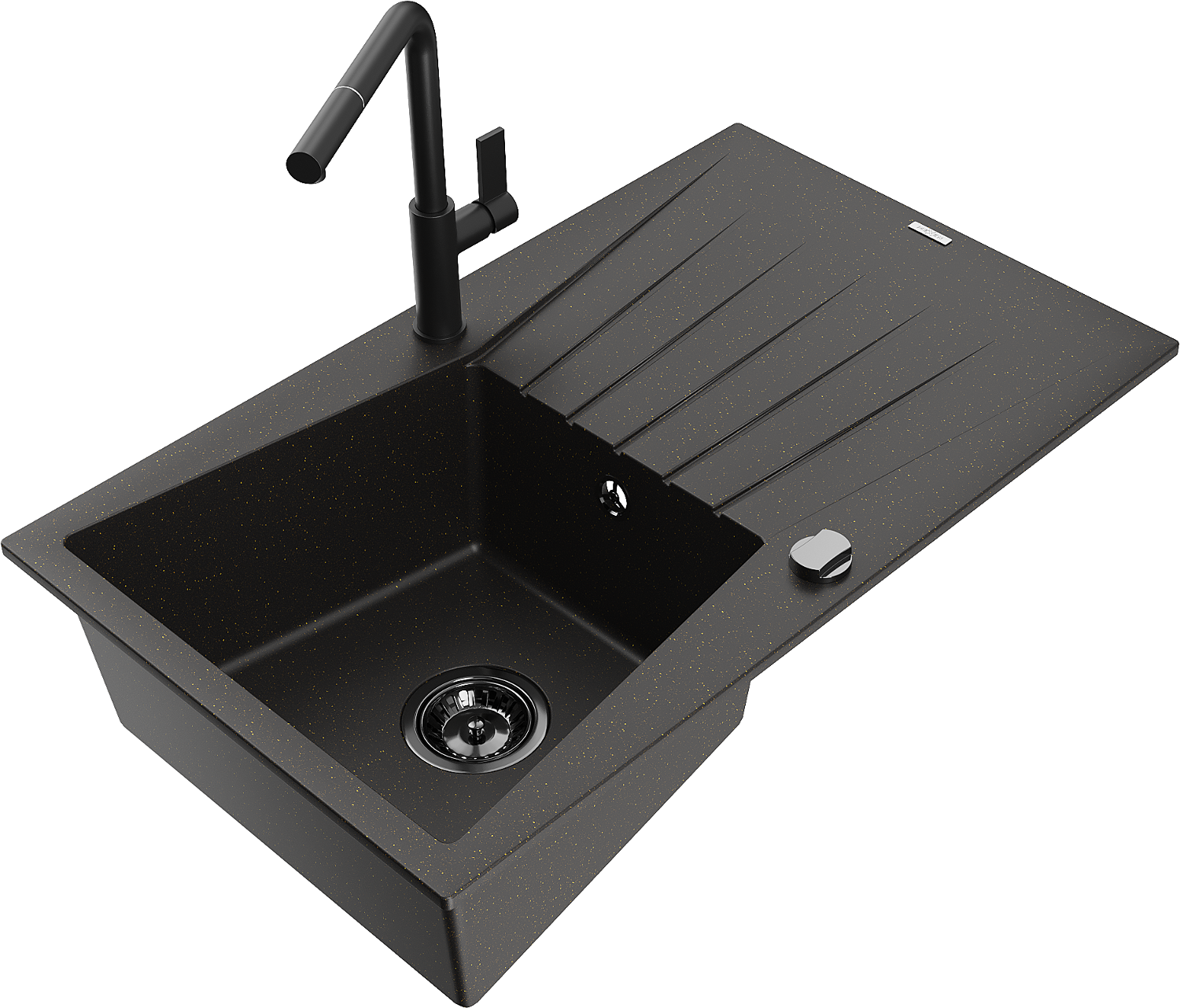 Mexen Cesar granitinė vienos kameros kriauklė su nutekamu ir Flora virtuviniu maišytuvu, juoda/auksinė metalinė