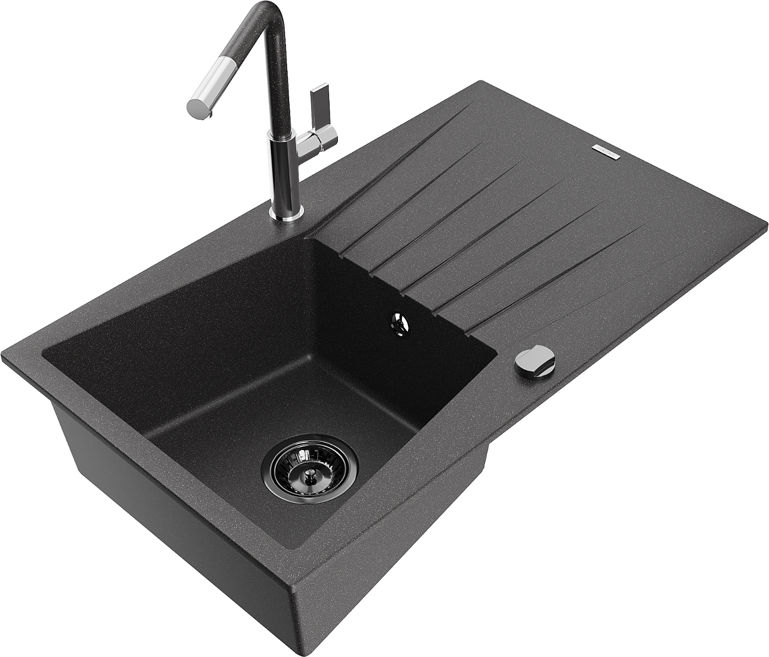 Mexen Cesar granitinė vienos kameros kriauklė su nutekėjimu ir Flora virtuvės maišytuvu, juoda su taškeliais