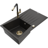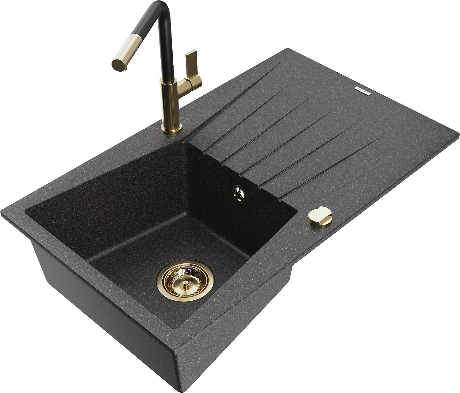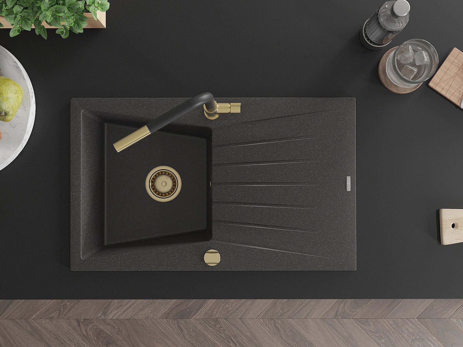Mexen Cesar granitinė vieno dubens kriauklė su stalčiumi ir Flora virtuviniu maišytuvu, juoda su taškeliais