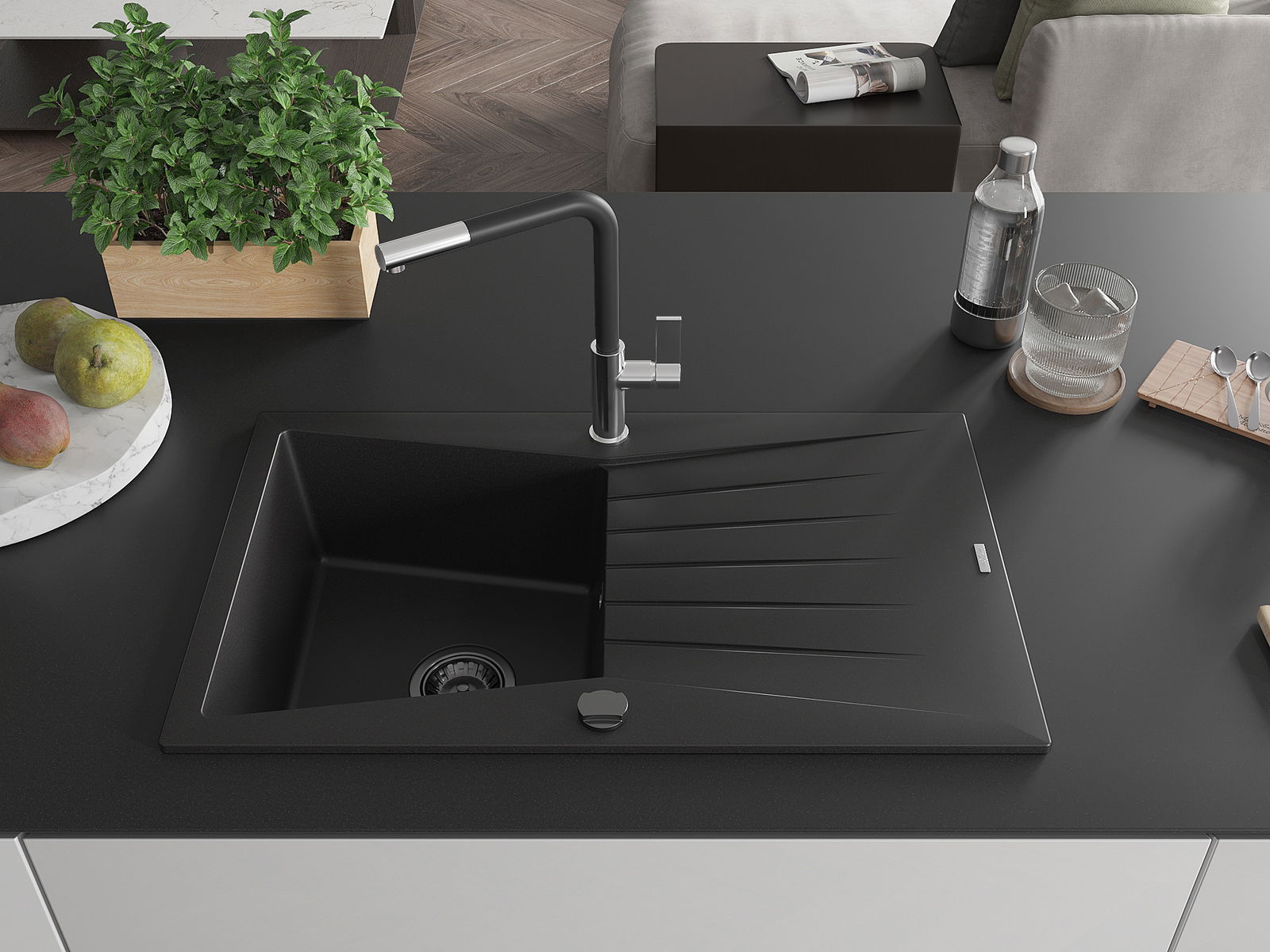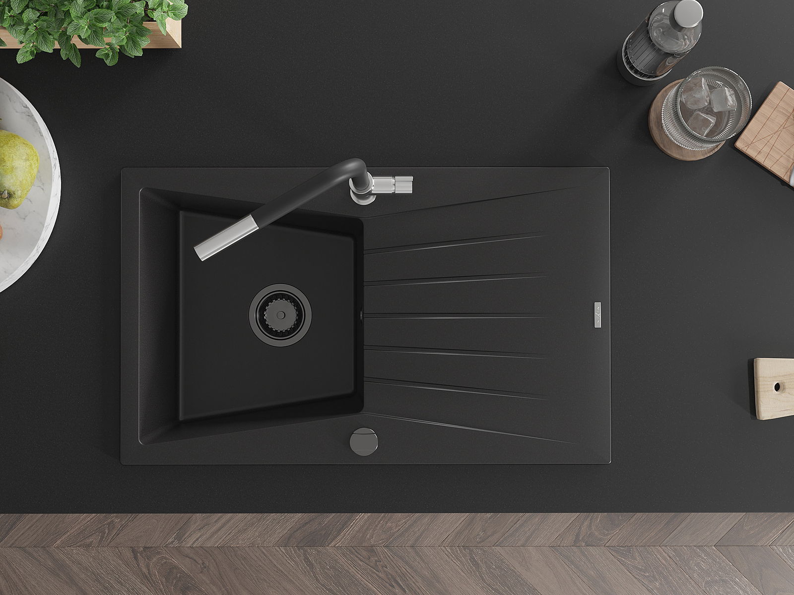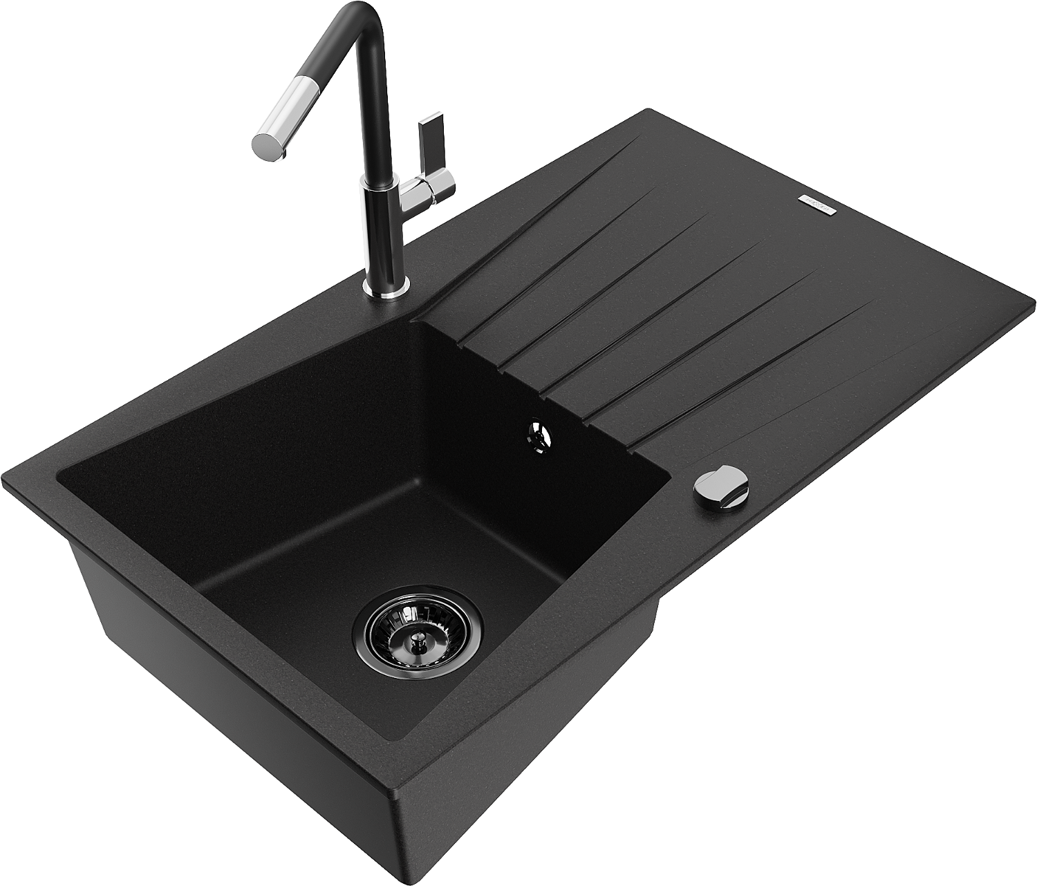 Mexen Cesar granitinė vienos plautuvės kriauklė su nusausintuvu ir Flora virtuvės maišytuvu, juoda - 6514-77-670401-07-B