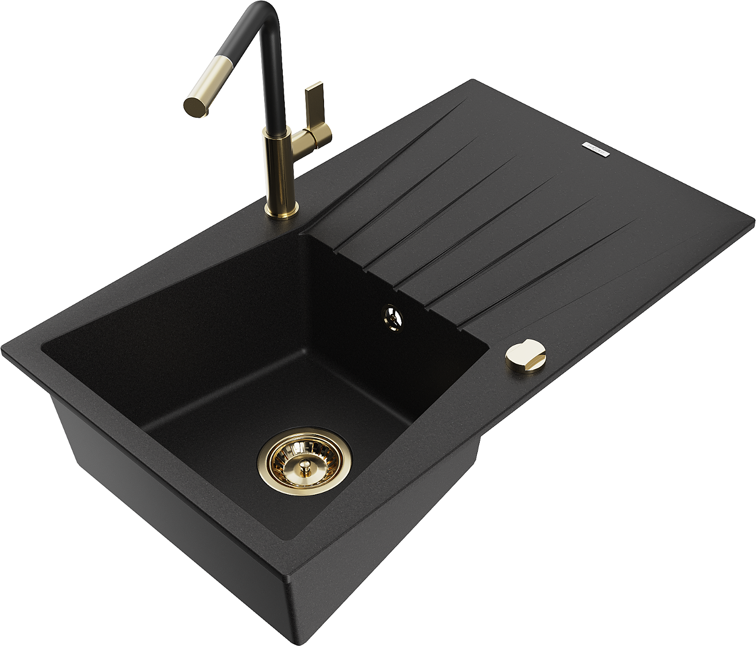 Mexen Cesar granitinis virtuvės kriauklė 1 dubens su nusausintuvu ir virtuvės maišytuvu Flora, juodas - 6514-77-670401-57-G
