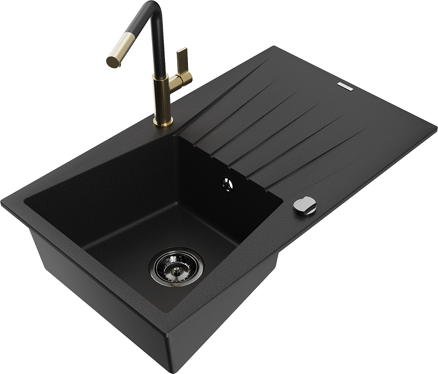 Mexen Cesar granitinis vienos kameros kriauklė su nusausintuvu ir Flora virtuviniu maišytuvu, juoda - 6514-77-670401-57-B