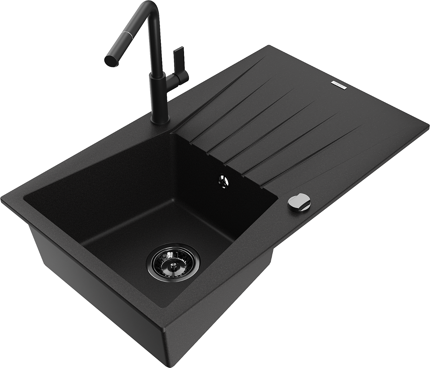Mexen Cesar granito praustuvas 1 kamerų su nutekėjimu ir virtuvės maišytuvu Flora, juoda - 6514-77-670401-70-B