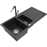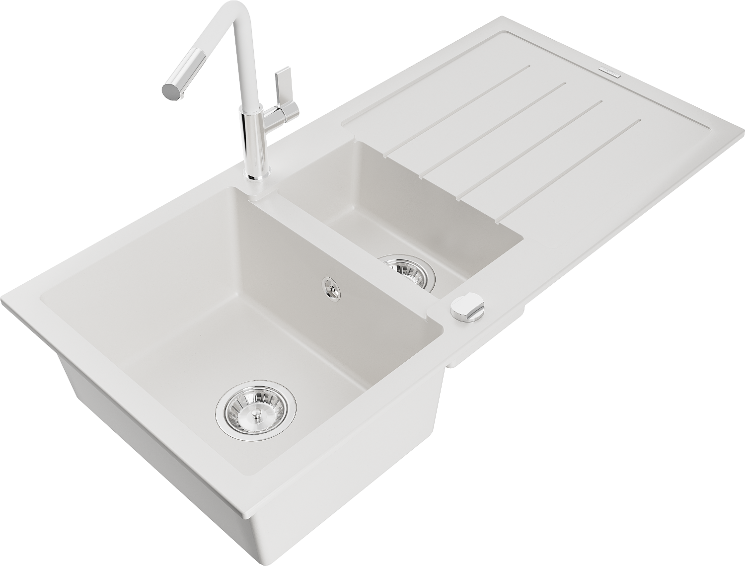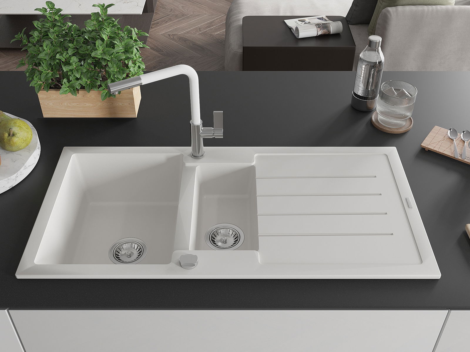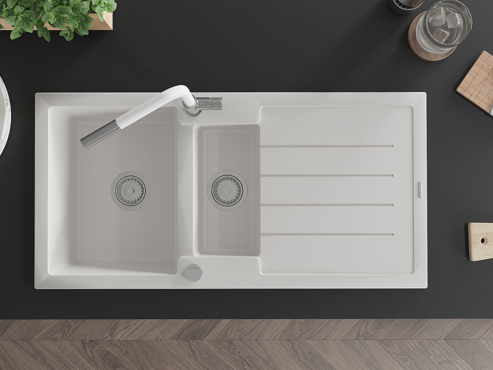Mexen Andres granitinė kriauklė, 1,5 skyrių su nusausinimo šluotele ir virtuvine Flora maišytuvu, balta - 6515-20-670401-02
