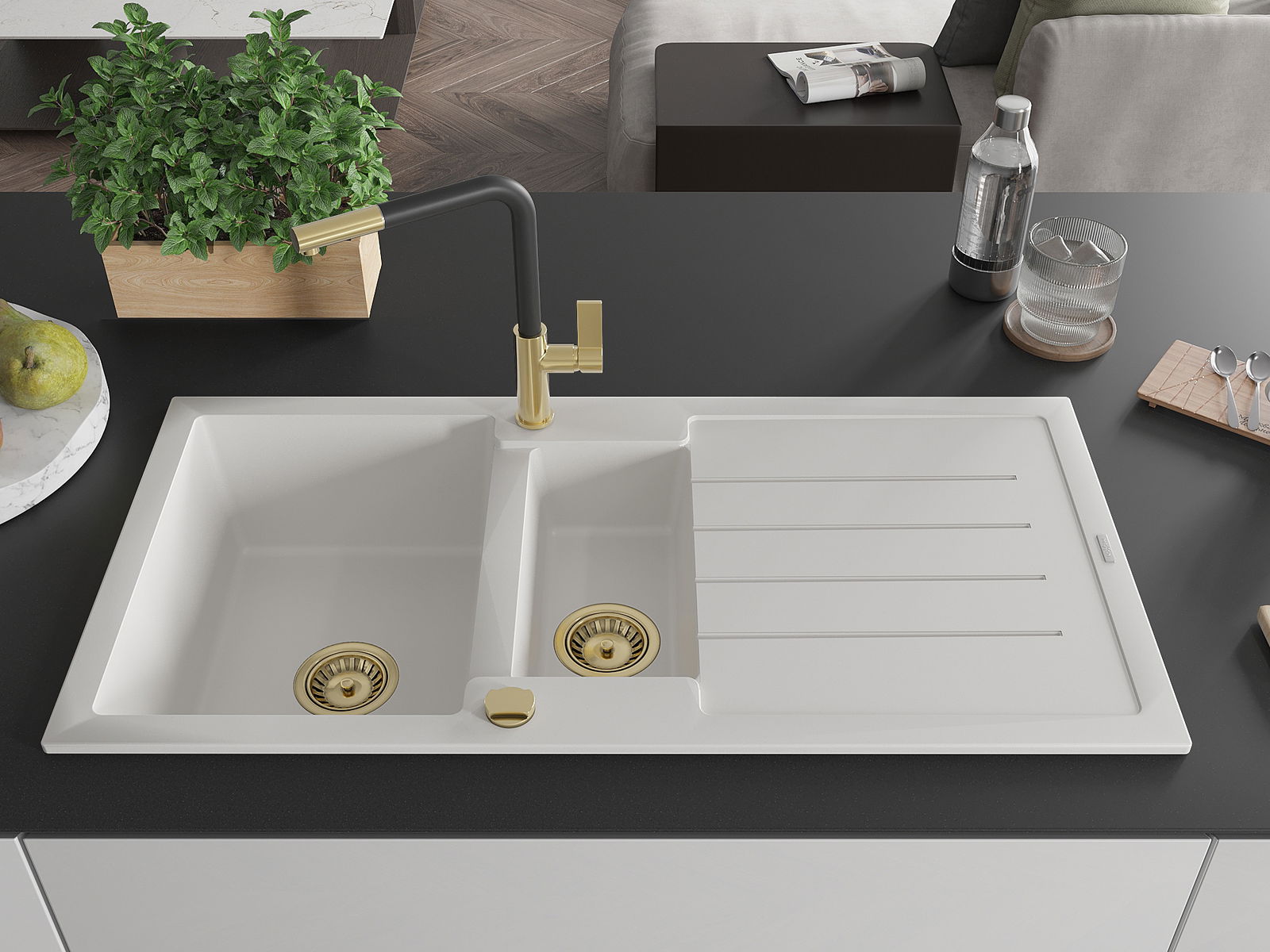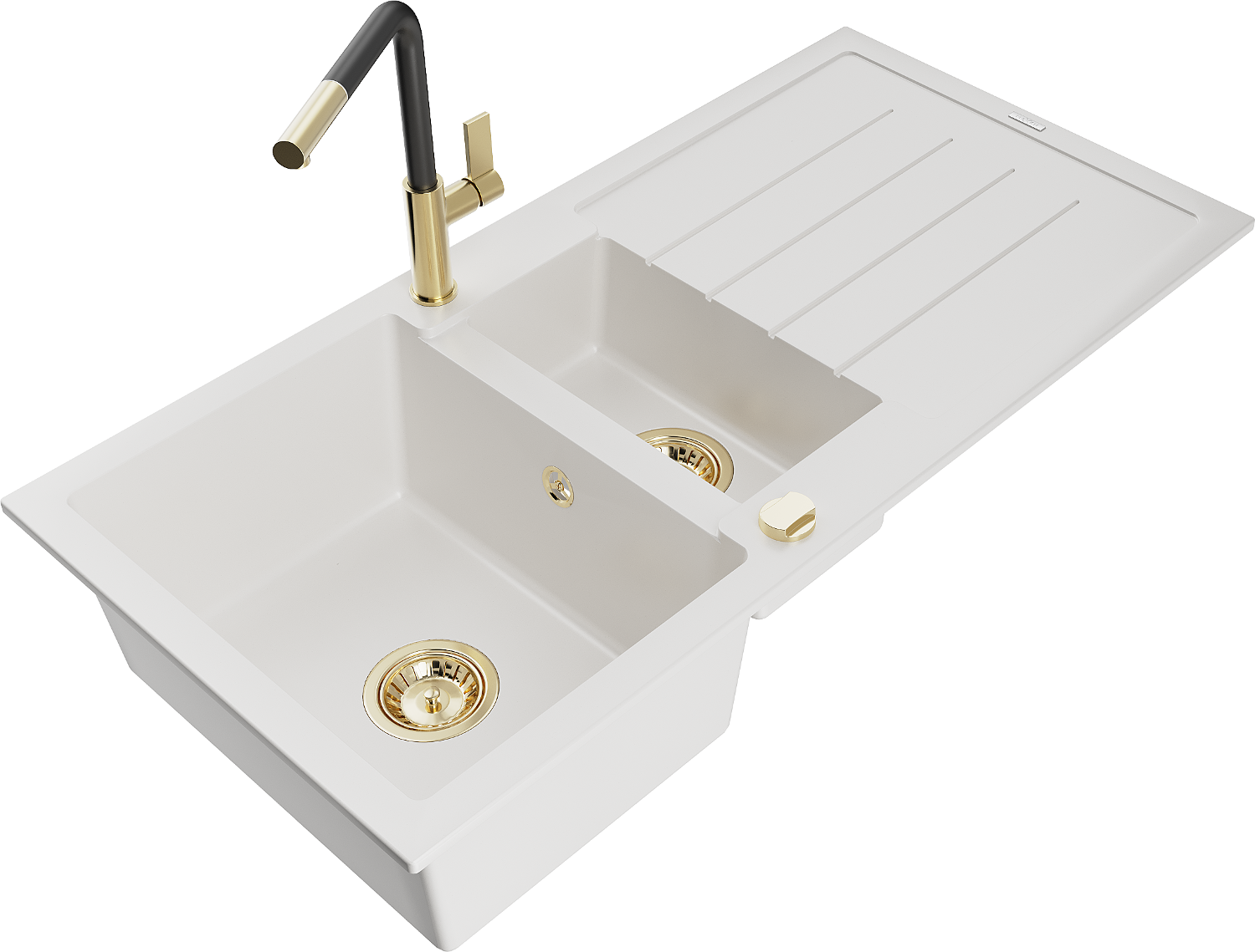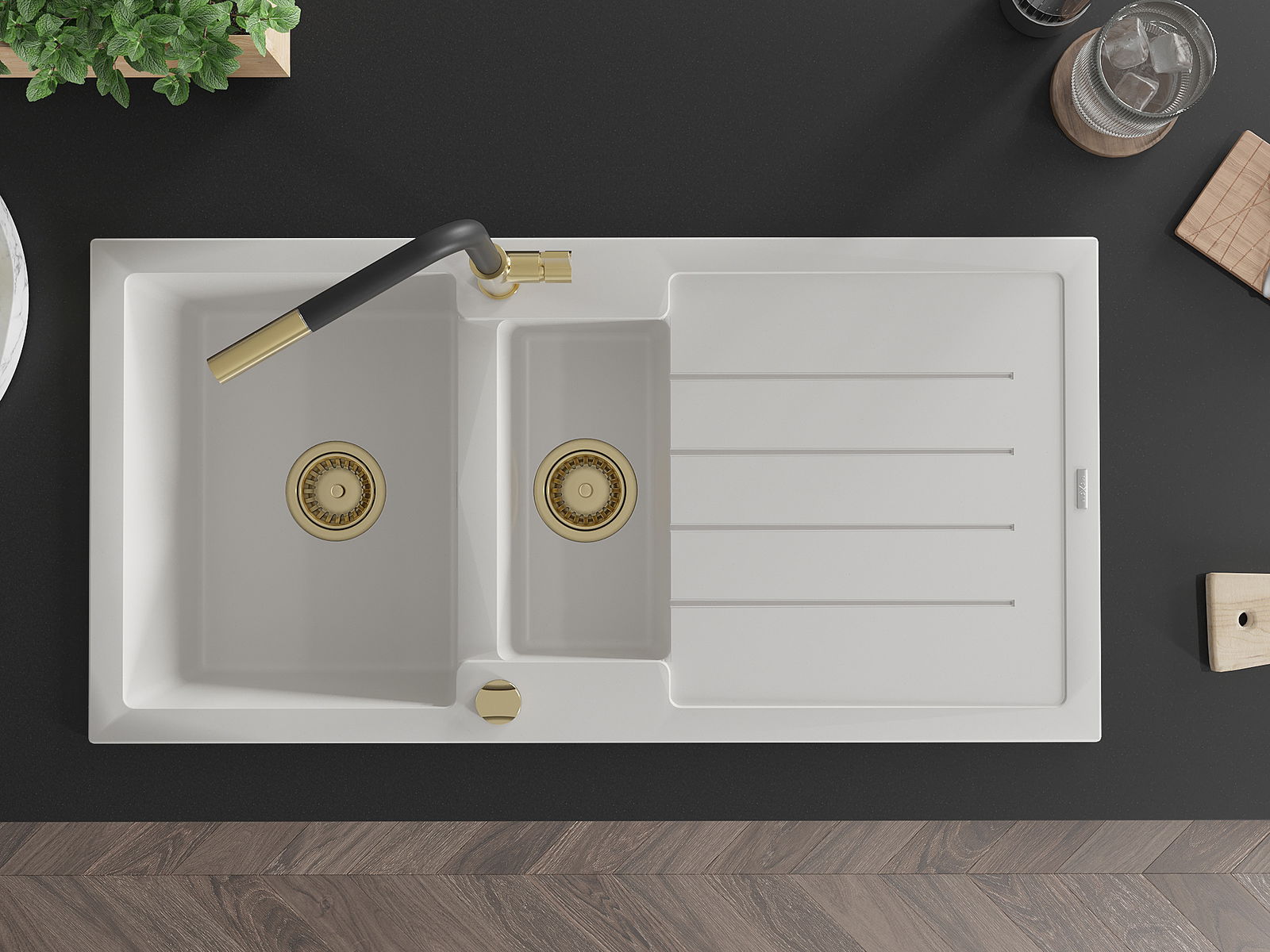 Mexen Andres granitinis plautuvės 1,5 skylių su nusausikliu ir virtuvės maišytuvu Flora, balta - 6515-20-670401-57-G