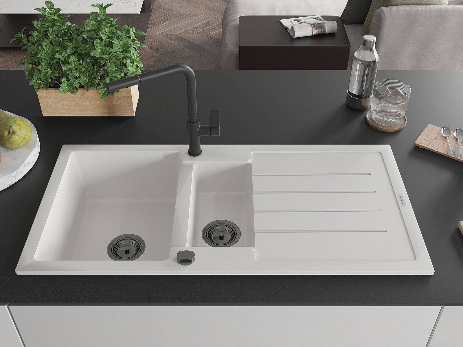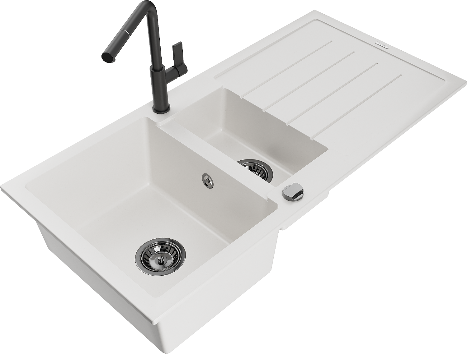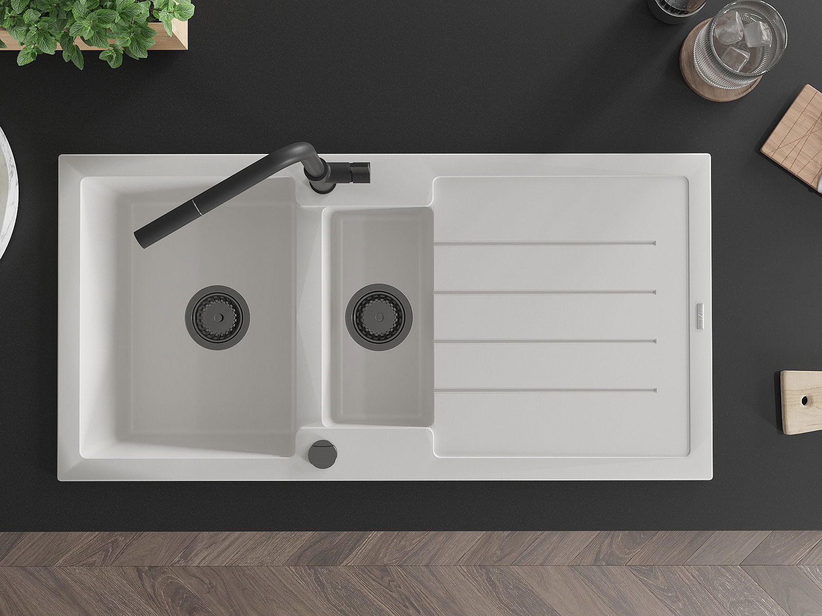 Mexen Andres granitinis plautuvė 1,5 kamerų su nutekėjimu ir virtuvės maišytuvu Flora, balta - 6515-20-670401-70-B