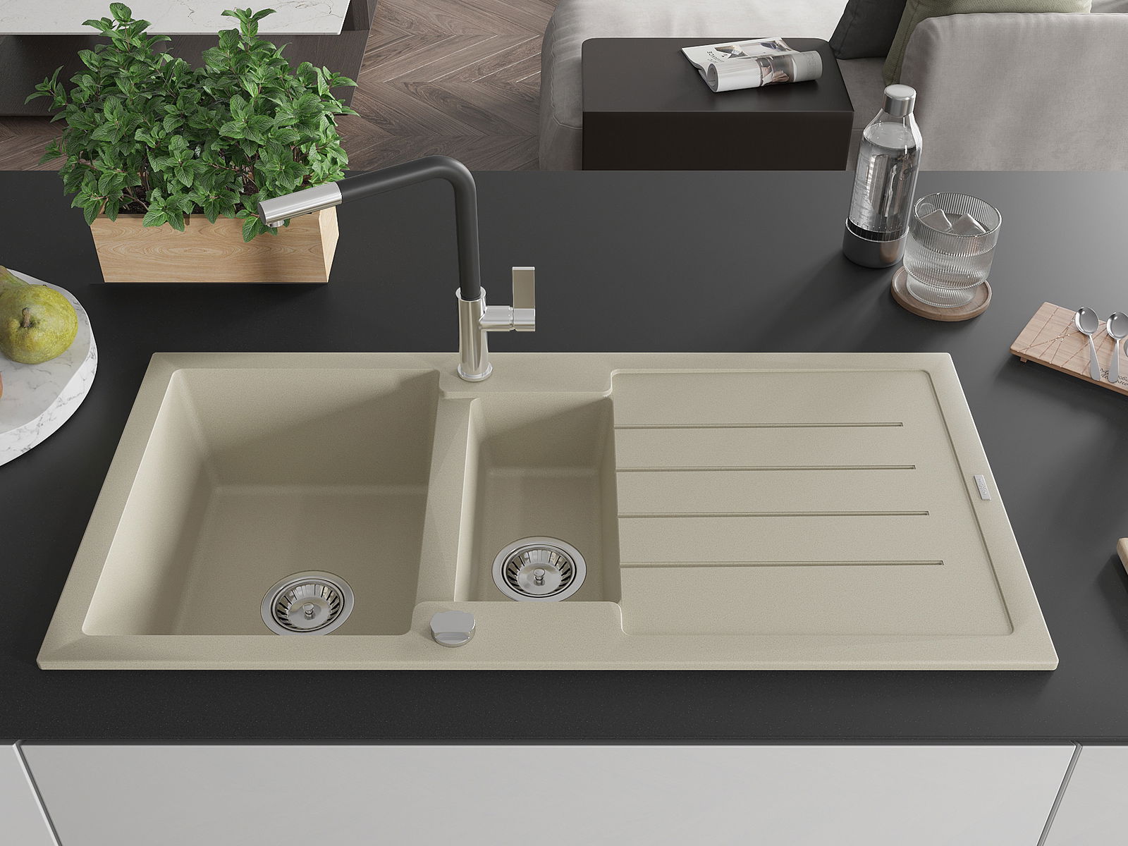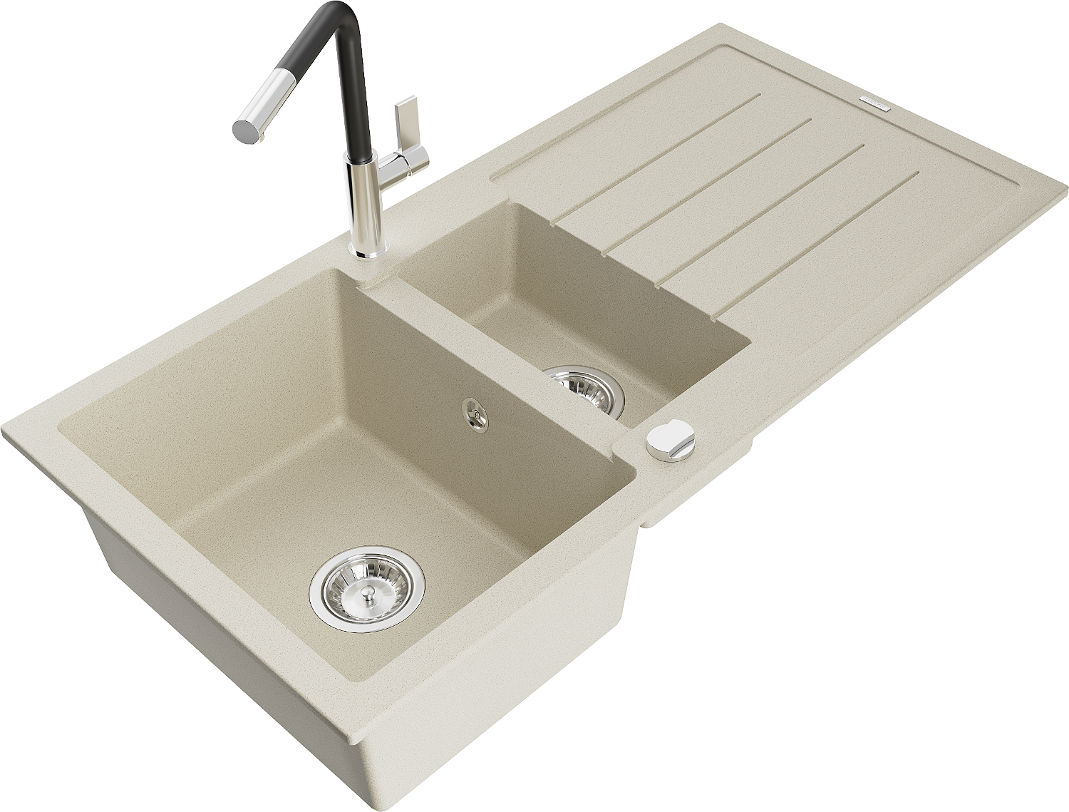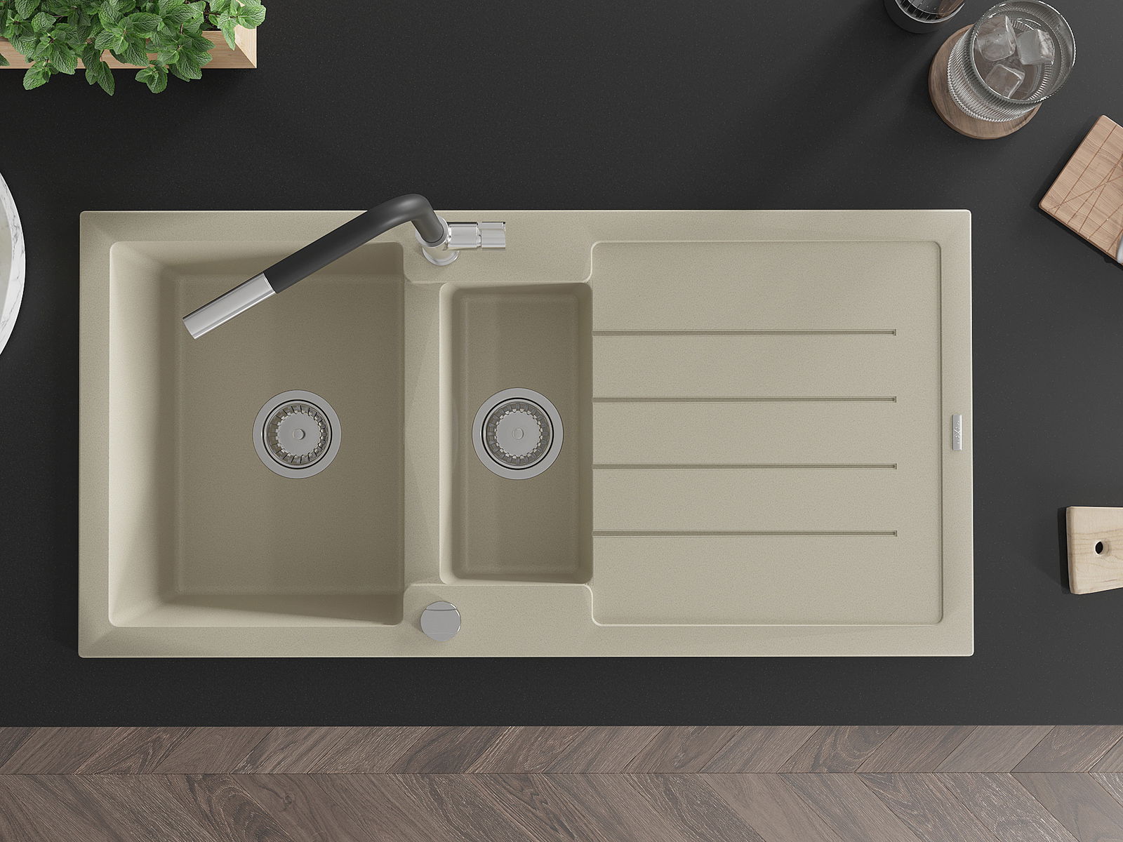 Mexen Andres granitinė 1,5 kamerų plautuvė su nuvarvėjimo paviršiumi ir virtuviniu maišytuvu Flora, smėlinė - 6515-69-670401-07
