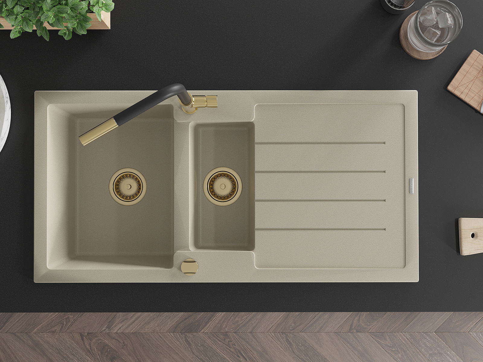 Kriauklė turi 2 iš anksto frezuotas skyles, kurių skersmuo yra 35 mm, skirtas savarankiškam išmušimui. Jas galima naudoti, pavyzdžiui, skysčio dozatoriaus montavimui, kuris pašalins plastikinių butelių buvimą virtuvėje ir suteiks jai elegantišką apdailą.