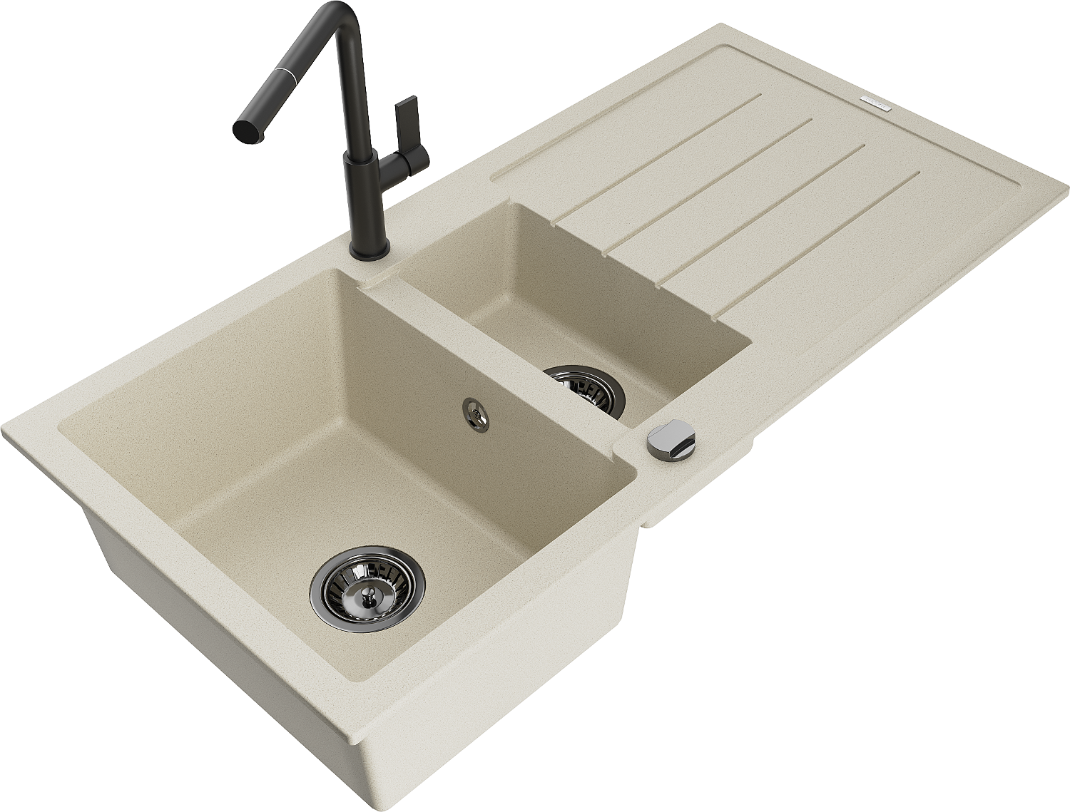 Mexen Andres 1,5 skyrių granitinė virtuvės kriauklė su nutekėjimu ir Flora maišytuvu, smėlio spalvos - 6515-69-670401-70-B