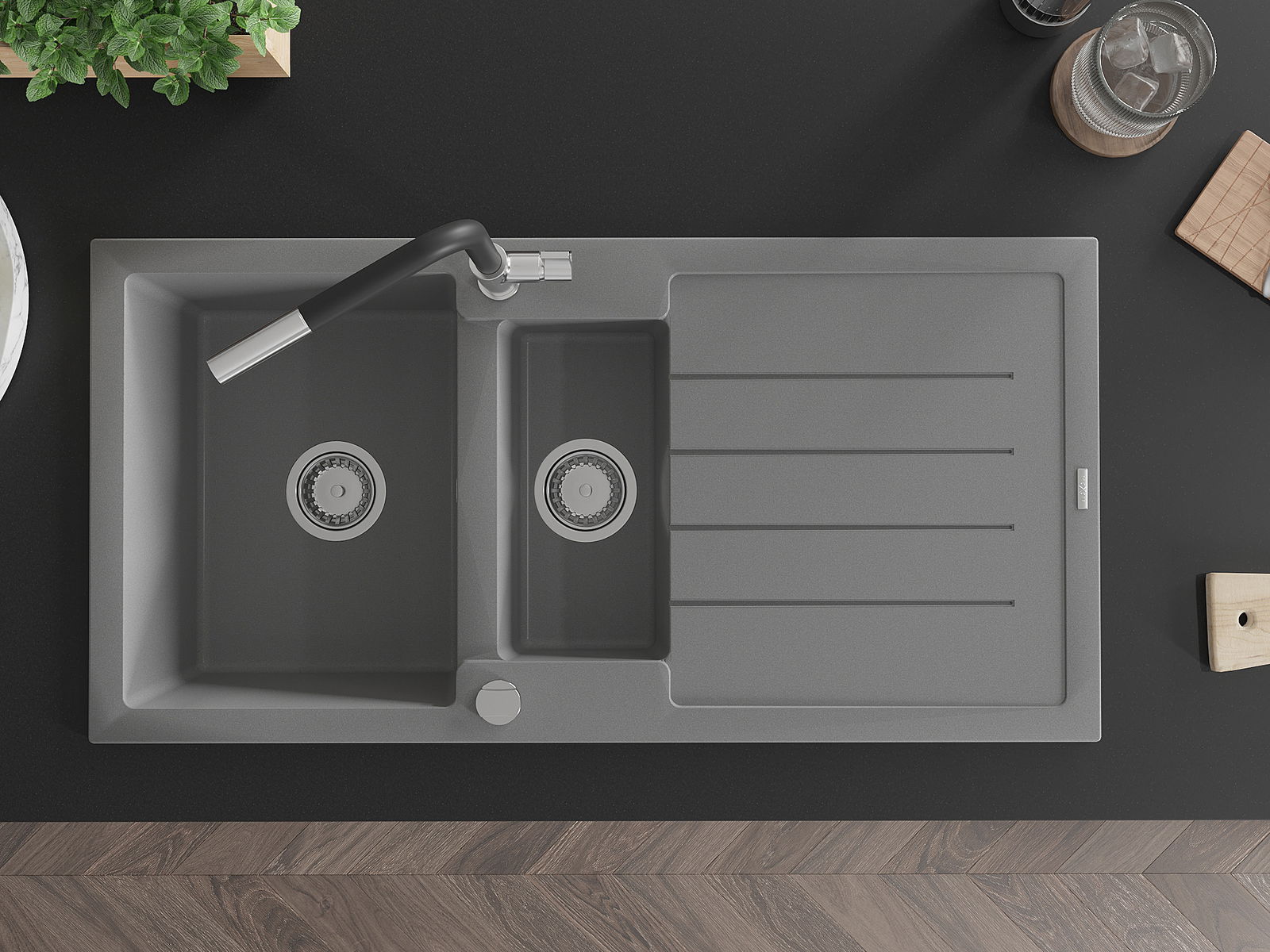 Mexen Andres granitinė 1,5 dubens plautuvė su nutekėjimu ir Flora virtuvės maišytuvu, pilka - 6515-71-670401-07