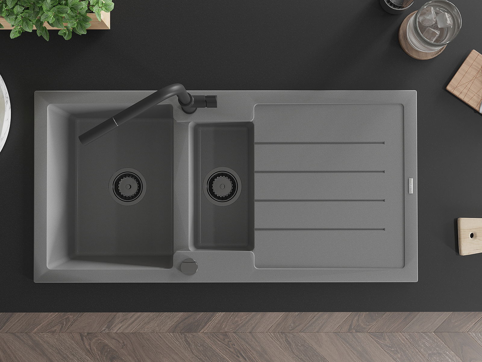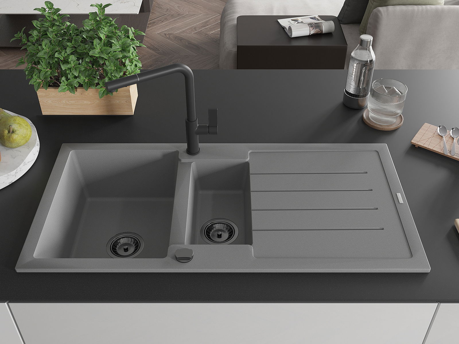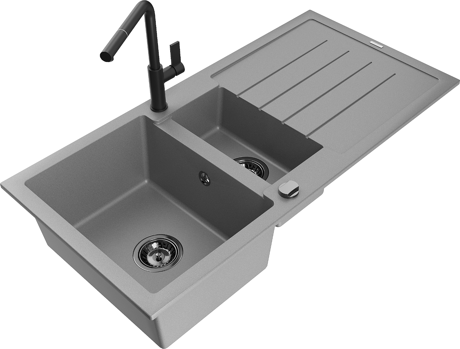 Mexen Andres granito plautuvė 1,5 jų skyrių su nutekėjimo išvade ir virtuvės maišytuvu Flora, pilka - 6515-71-670401-70-B