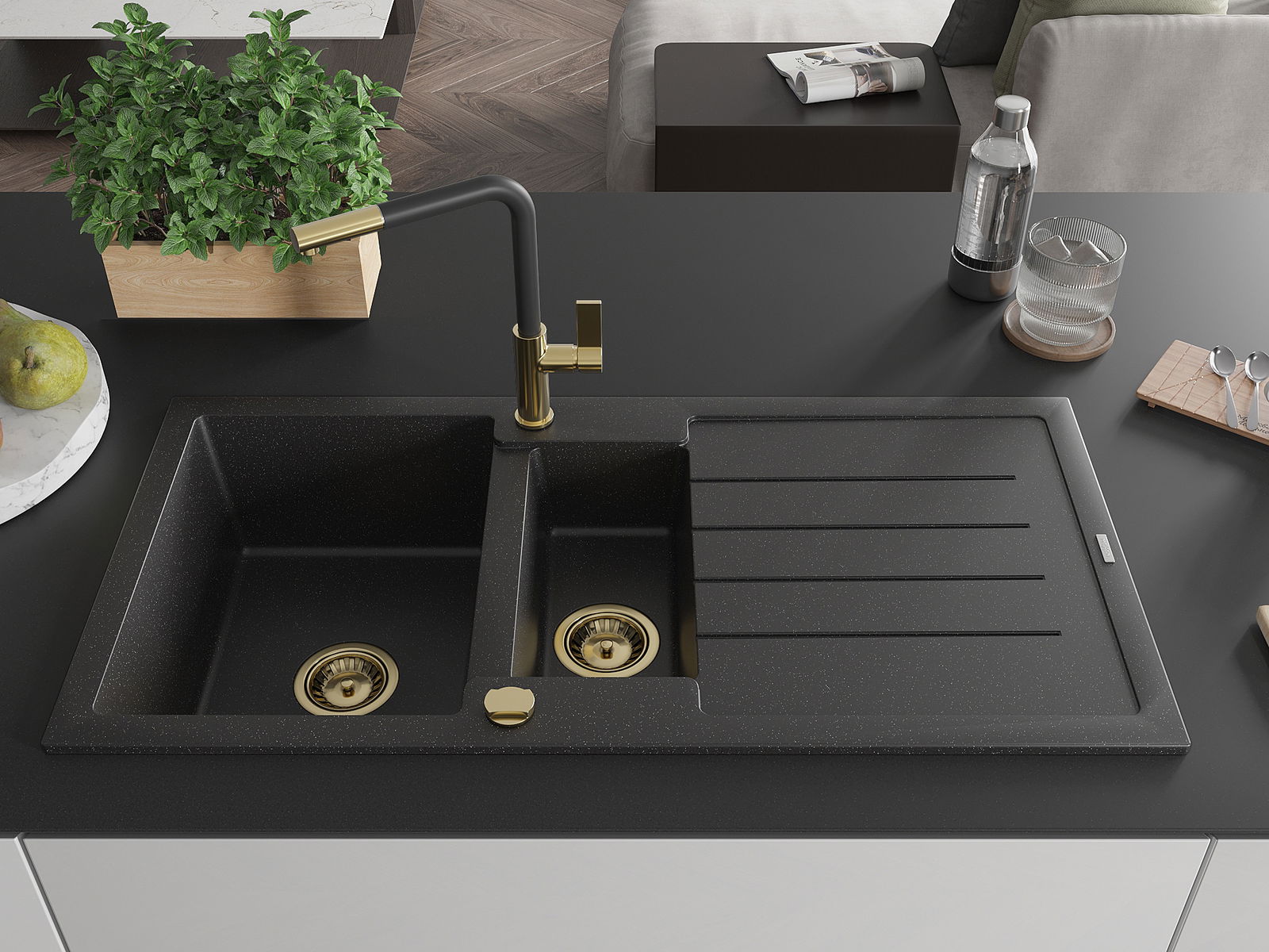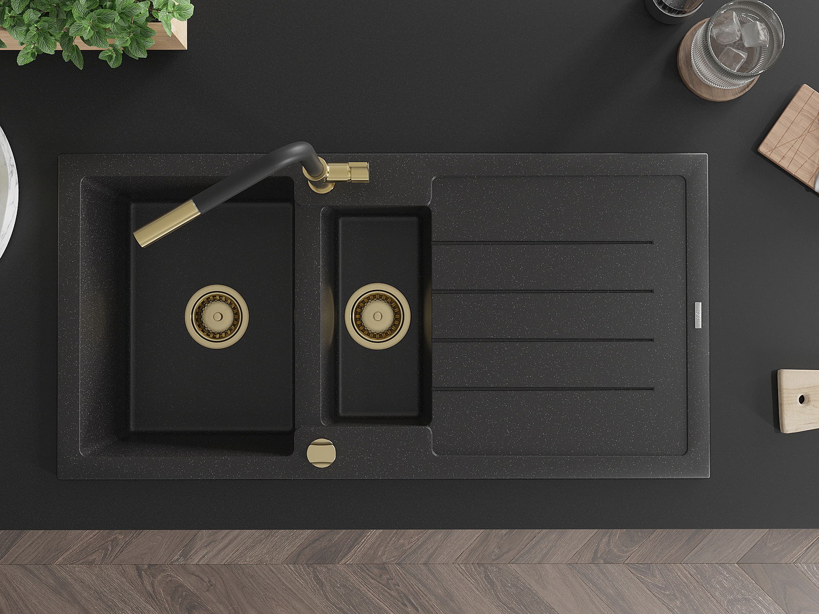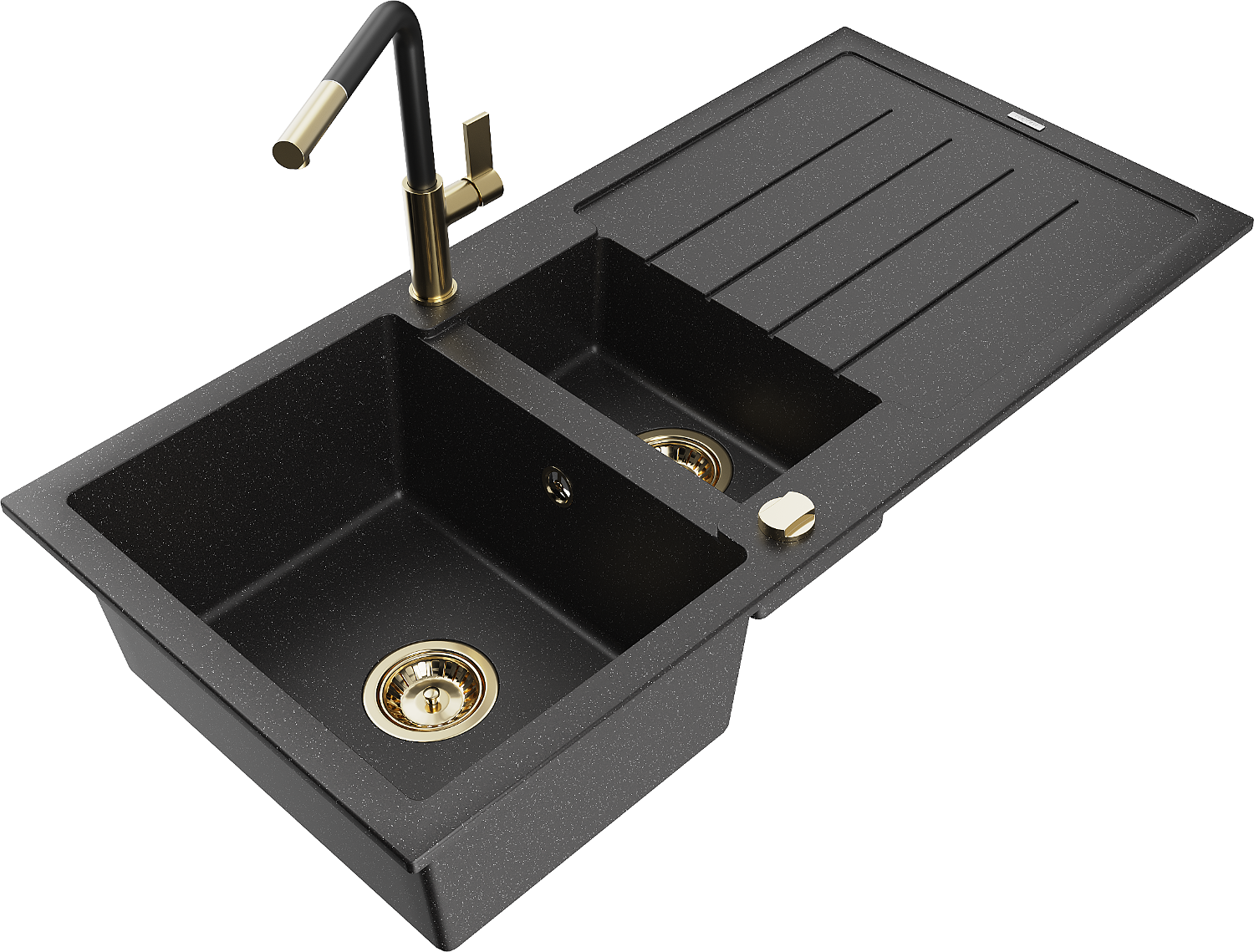 Mexen Andres dviejų skyrių granitinė plautuvė su džiovykla ir virtuviniu maišytuvu Flora, juoda/sidabrinė - 6515-73-670401-57-G