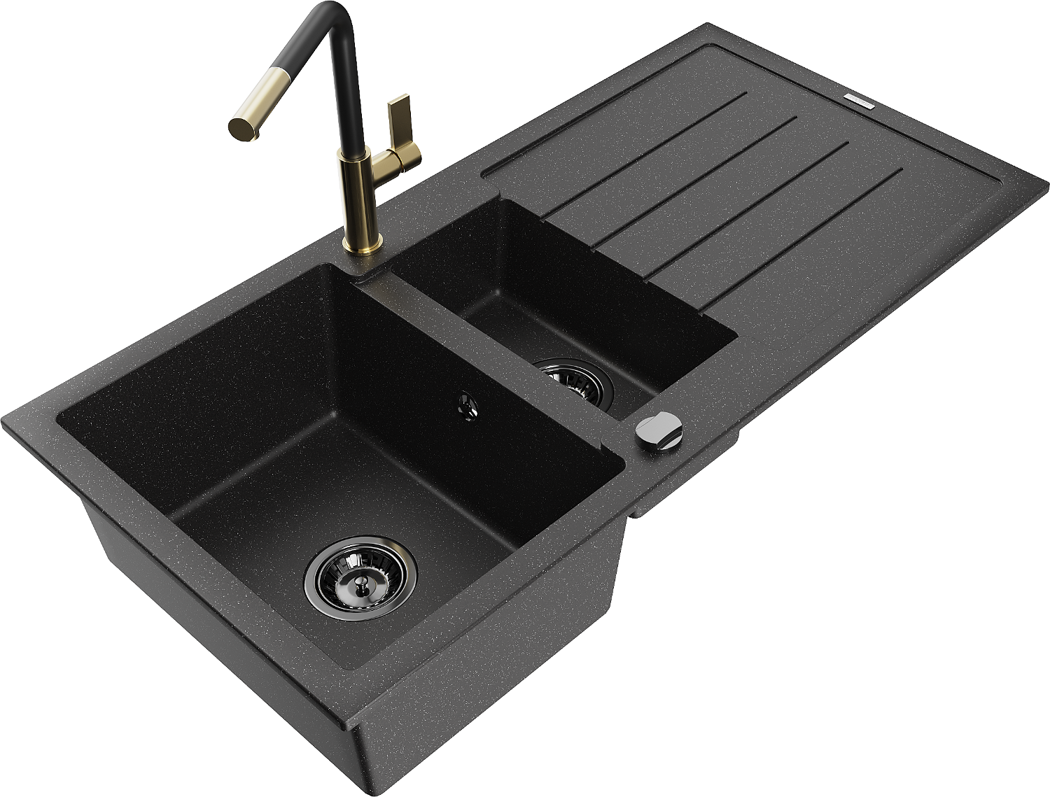 Mexen Andres granitinė 1,5 skyrių kriauklė su nusausinimo staleliu ir virtuvės maišytuvu Flora, juoda/sidabrinė