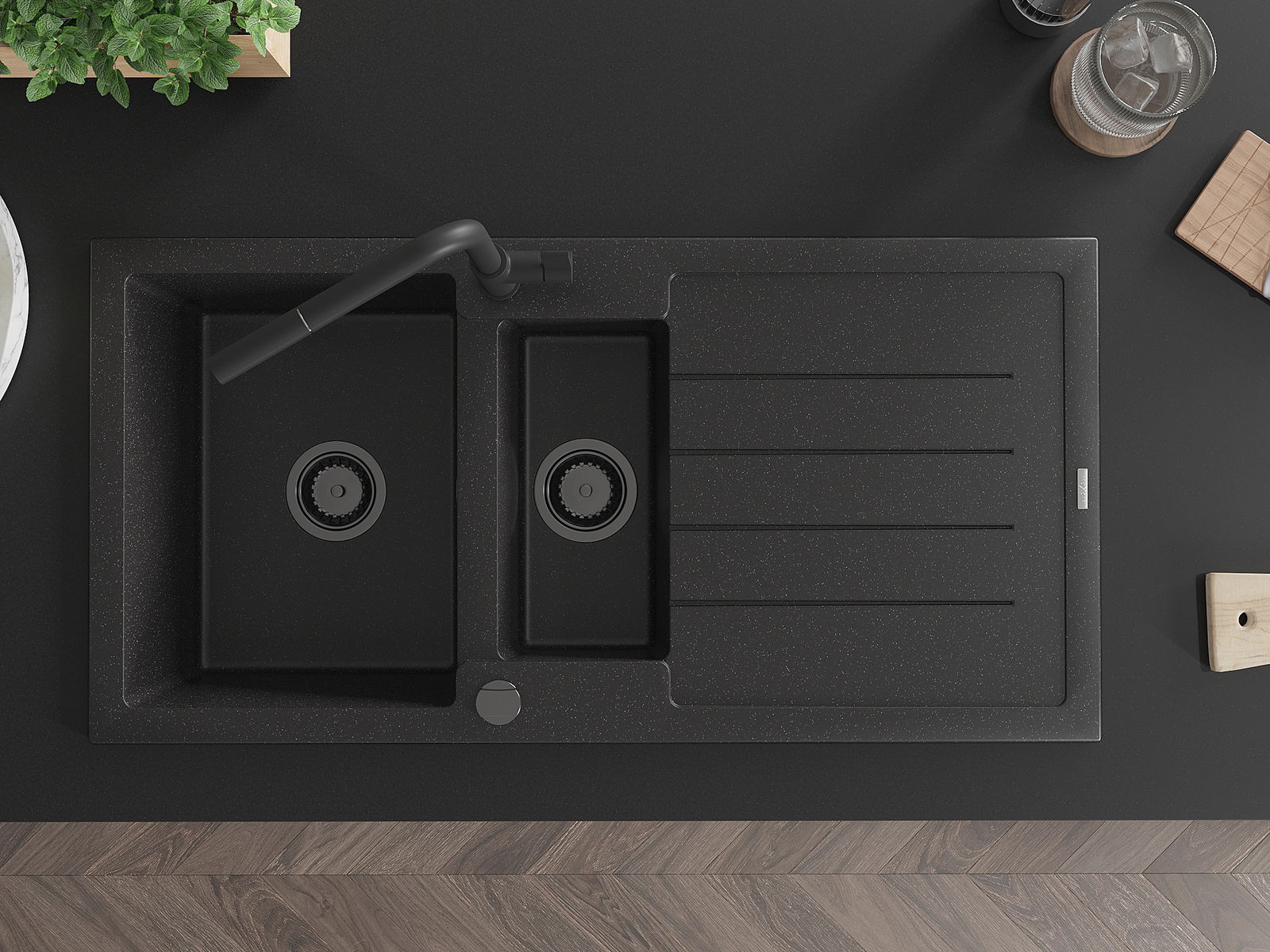 Mexen Andres granito plautuvė 1,5 skyrių su drenažu ir virtuviniu maišytuvu Flora, juoda/sidabrinė - 6515-73-670401-70-B
