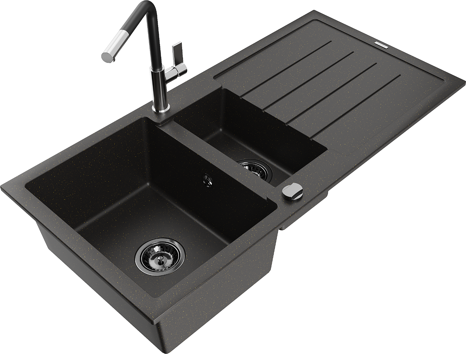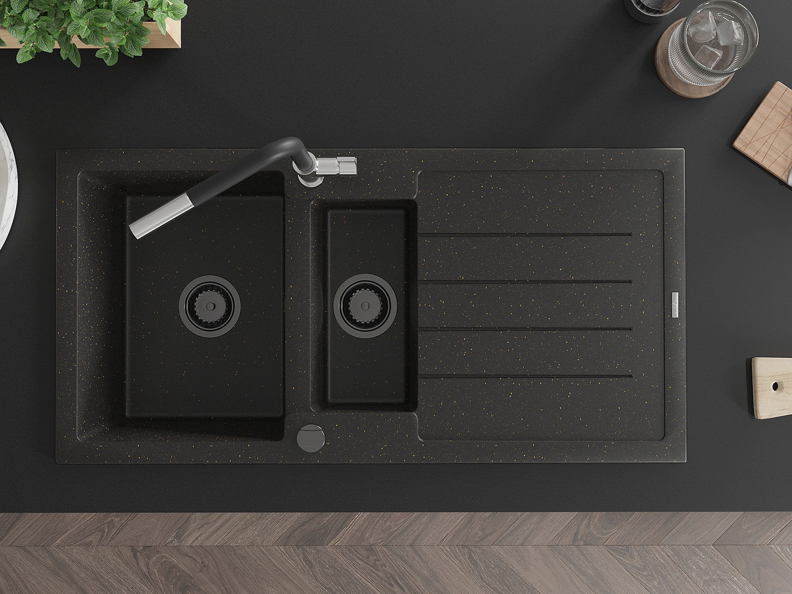 Mexen Andres granitinė 1,5 skyliapos kriauklė su nusausintuvu ir virtuviniu Flora maišytuvu, juoda/auksinė
