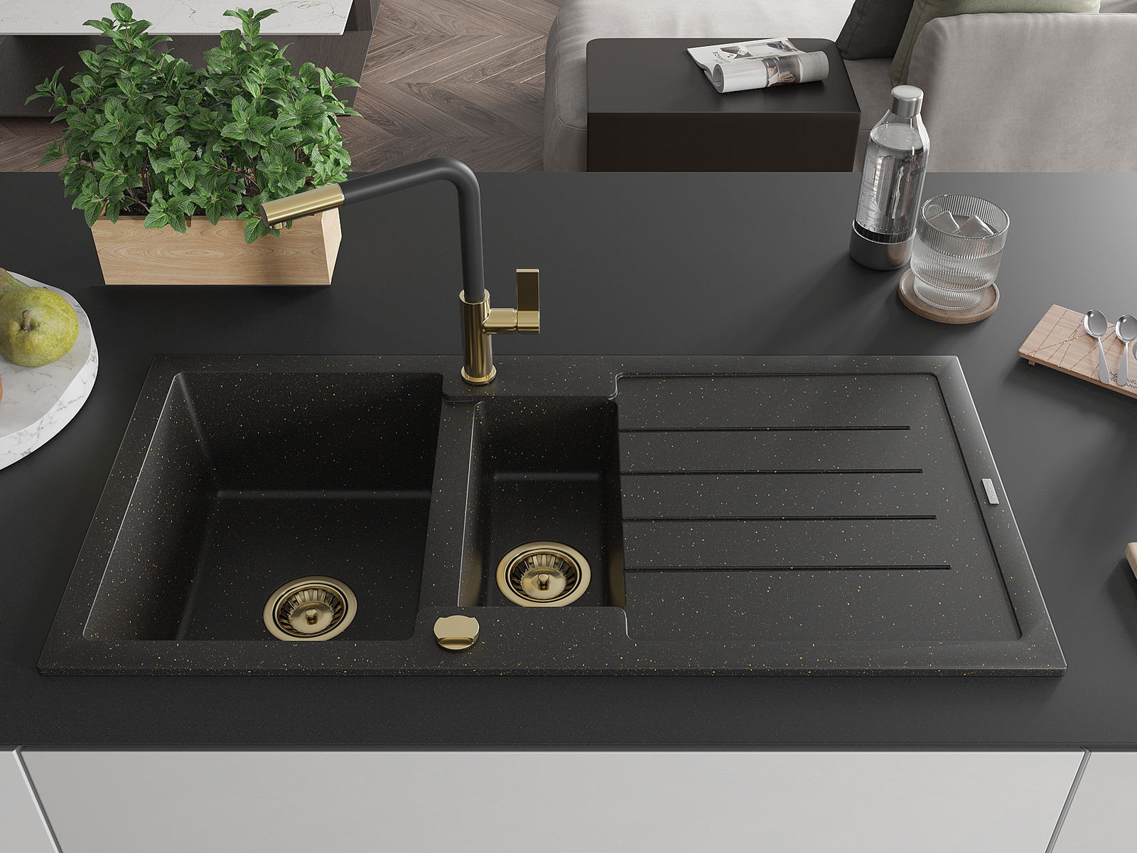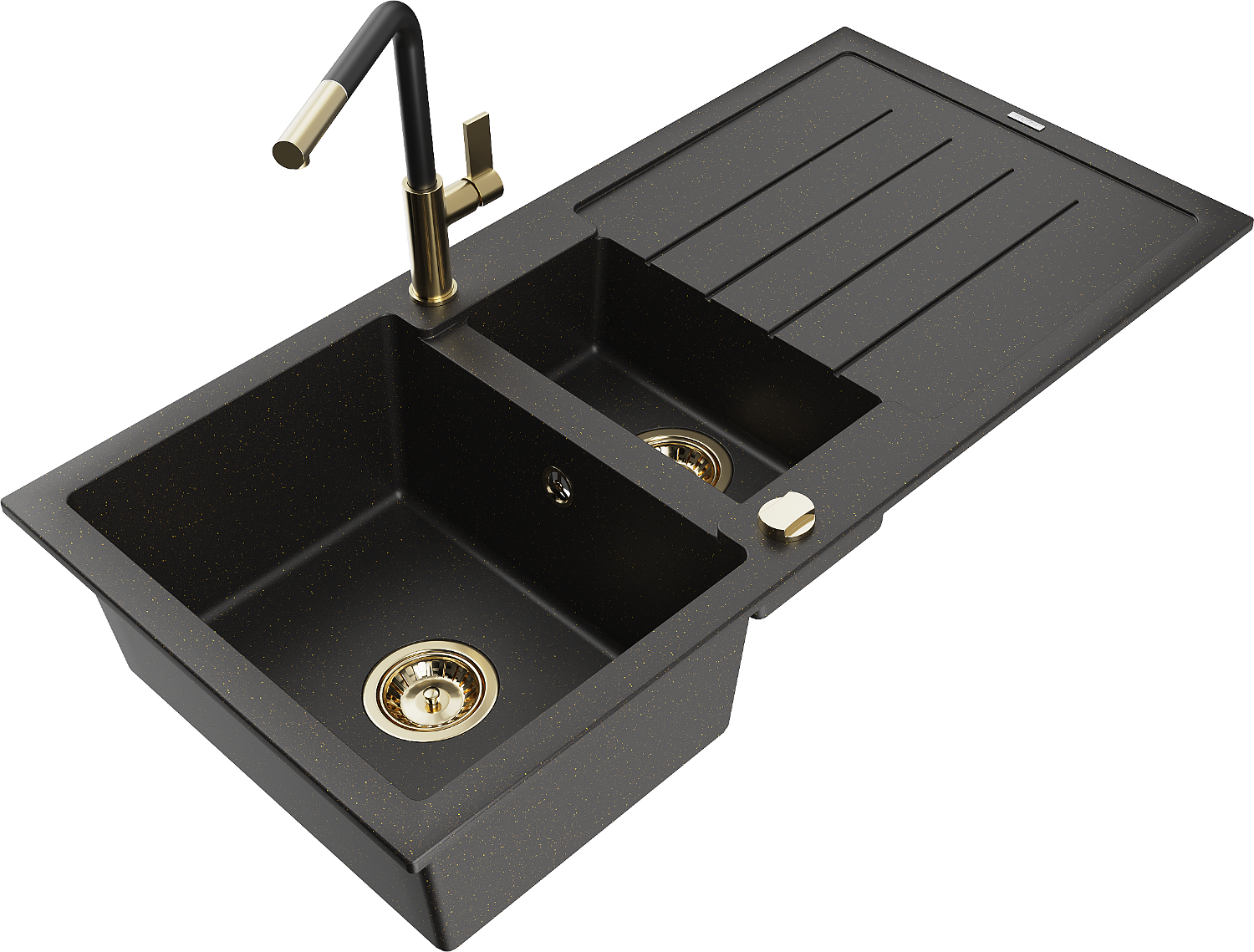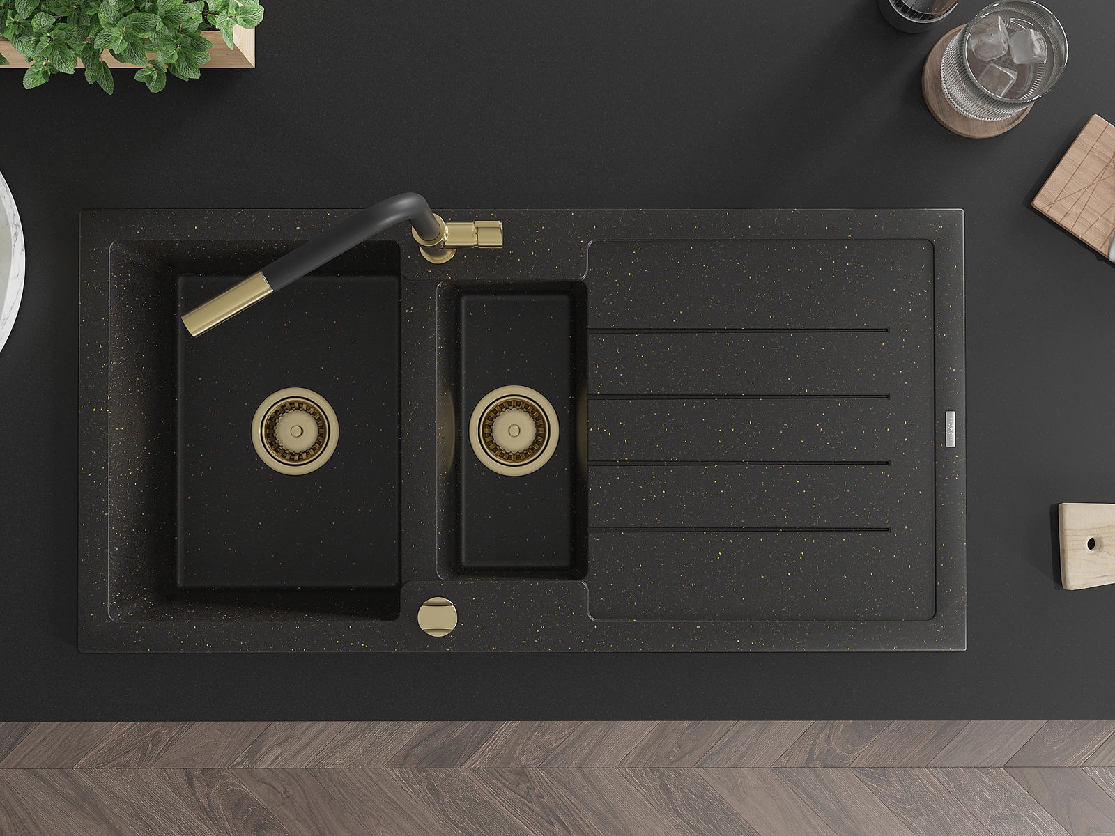 Mexen Andres granitinė plautuvė 1,5 dubenų su drenažu ir virtuviniu maišytuvu Flora, juoda/auksinė - 6515-75-670401-57-G