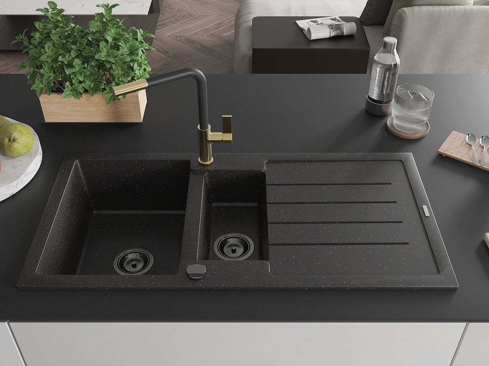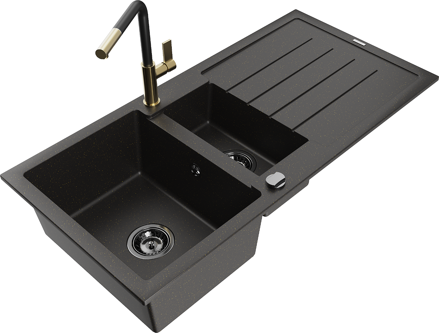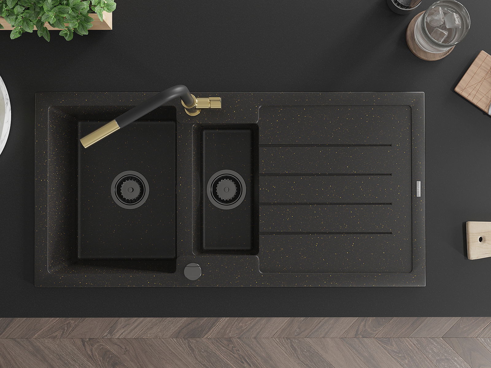 Mexen Andres 1,5 pusės granitinė kriauklė su nusausintuvu ir Flora virtuviniu maišytuvu, juoda/auksinė