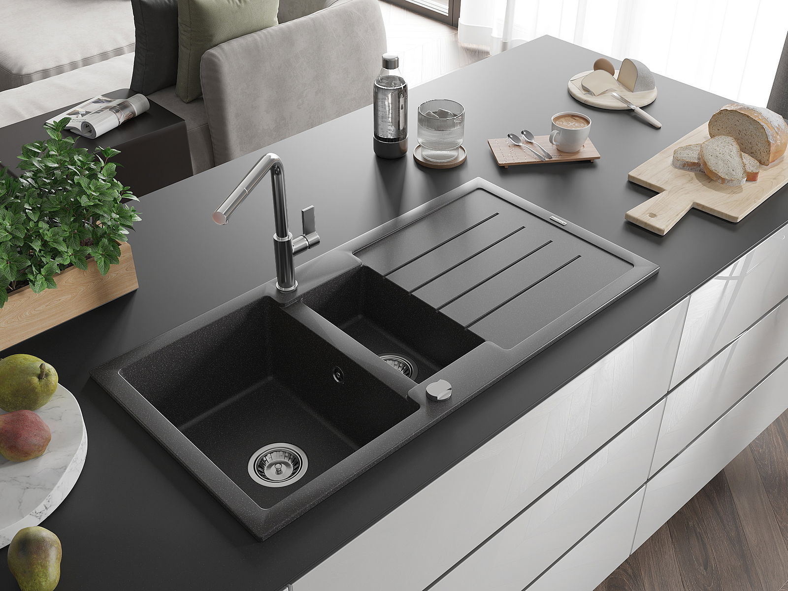 Kriauklė turi 2 iš anksto frezuotas skyles, kurių skersmuo yra 35 mm, skirtas savarankiškam išmušimui. Jas galima naudoti, pavyzdžiui, skysčio dozatoriaus montavimui, kuris pašalins plastikinių butelių buvimą virtuvėje ir suteiks jai elegantišką apdailą.
