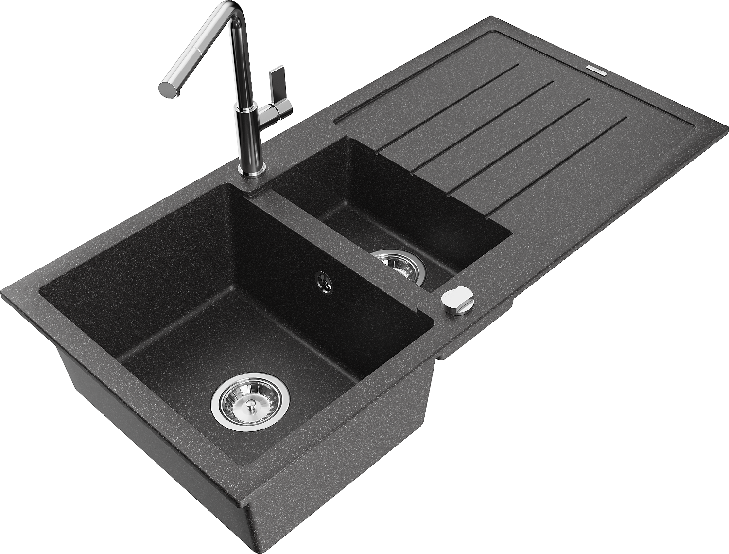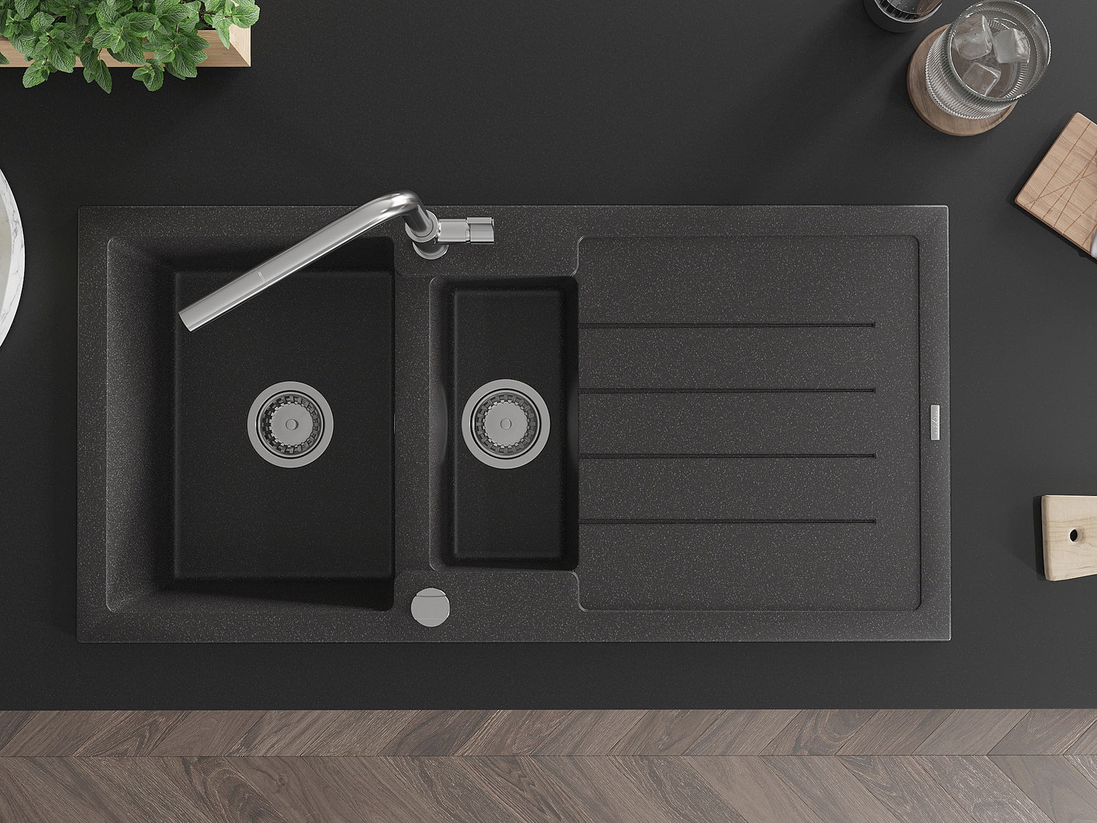 Mexen Andres granitinė 1,5 skylių plautuvė su nubėgimo vieta ir virtuviniu maišytuvu Flora, juoda su taškeliais