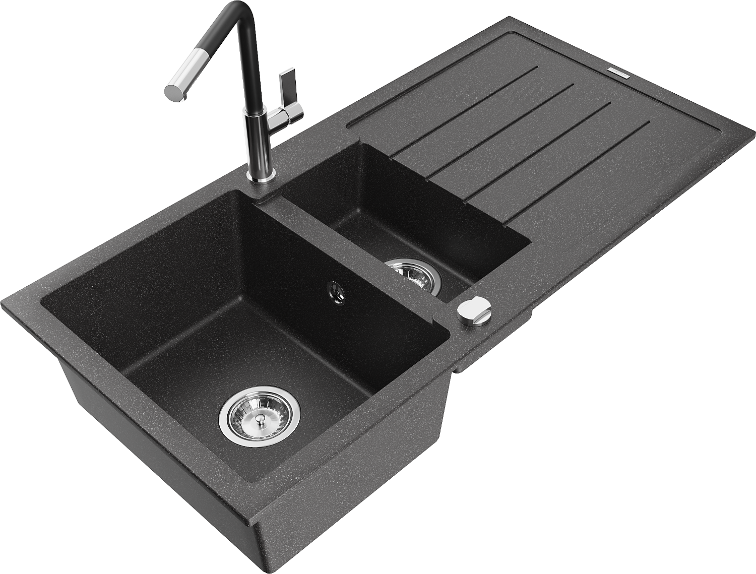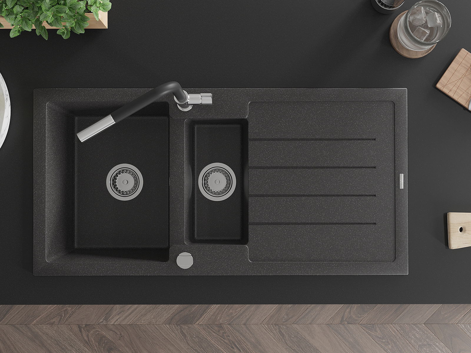 Mexen Andres granitinis 1,5 skylių plautuvė su drenažu ir virtuviniu maišytuvu Flora, juoda dėmėta - 6515-76-670401-07
