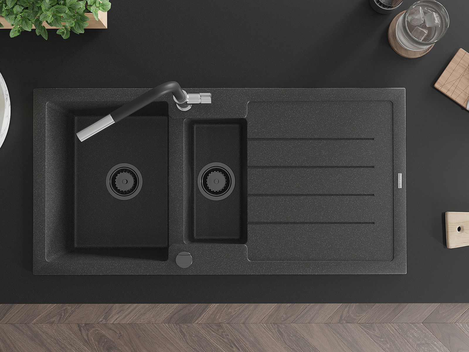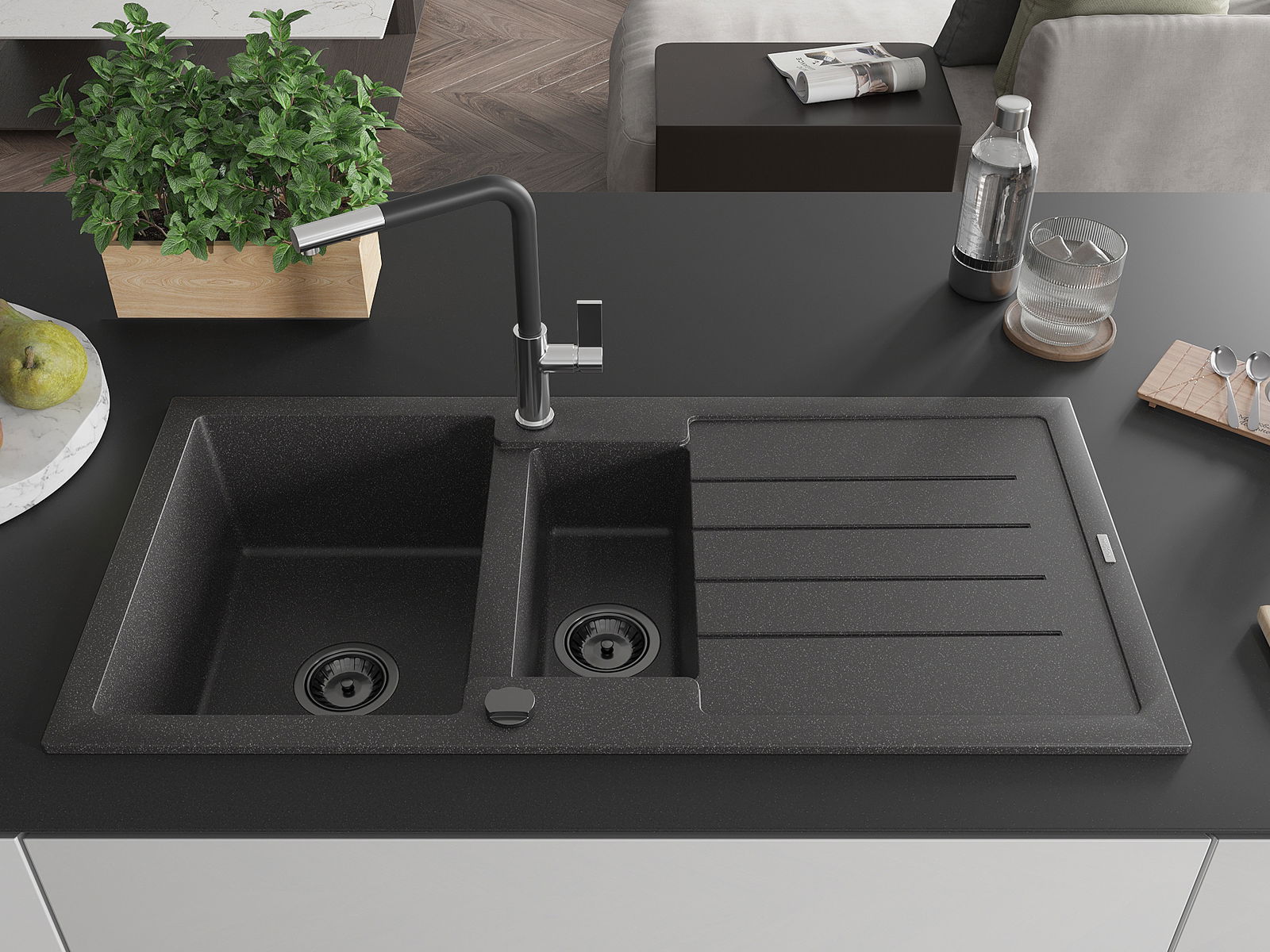 Kriauklė turi 2 iš anksto frezuotas skyles, kurių skersmuo yra 35 mm, skirtas savarankiškam išmušimui. Jas galima naudoti, pavyzdžiui, skysčio dozatoriaus montavimui, kuris pašalins plastikinių butelių buvimą virtuvėje ir suteiks jai elegantišką apdailą.