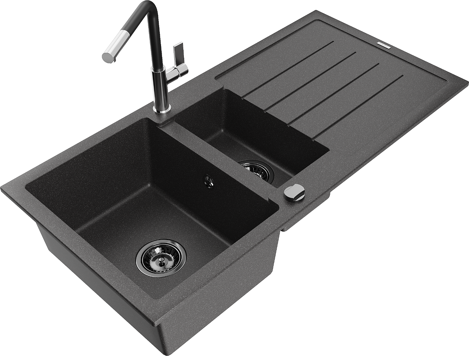Mexen Andres 1,5 kamerų granitinė kriauklė su nusausintuvu ir Flora virtuvės maišytuvu, juoda su taškuotu paviršiumi