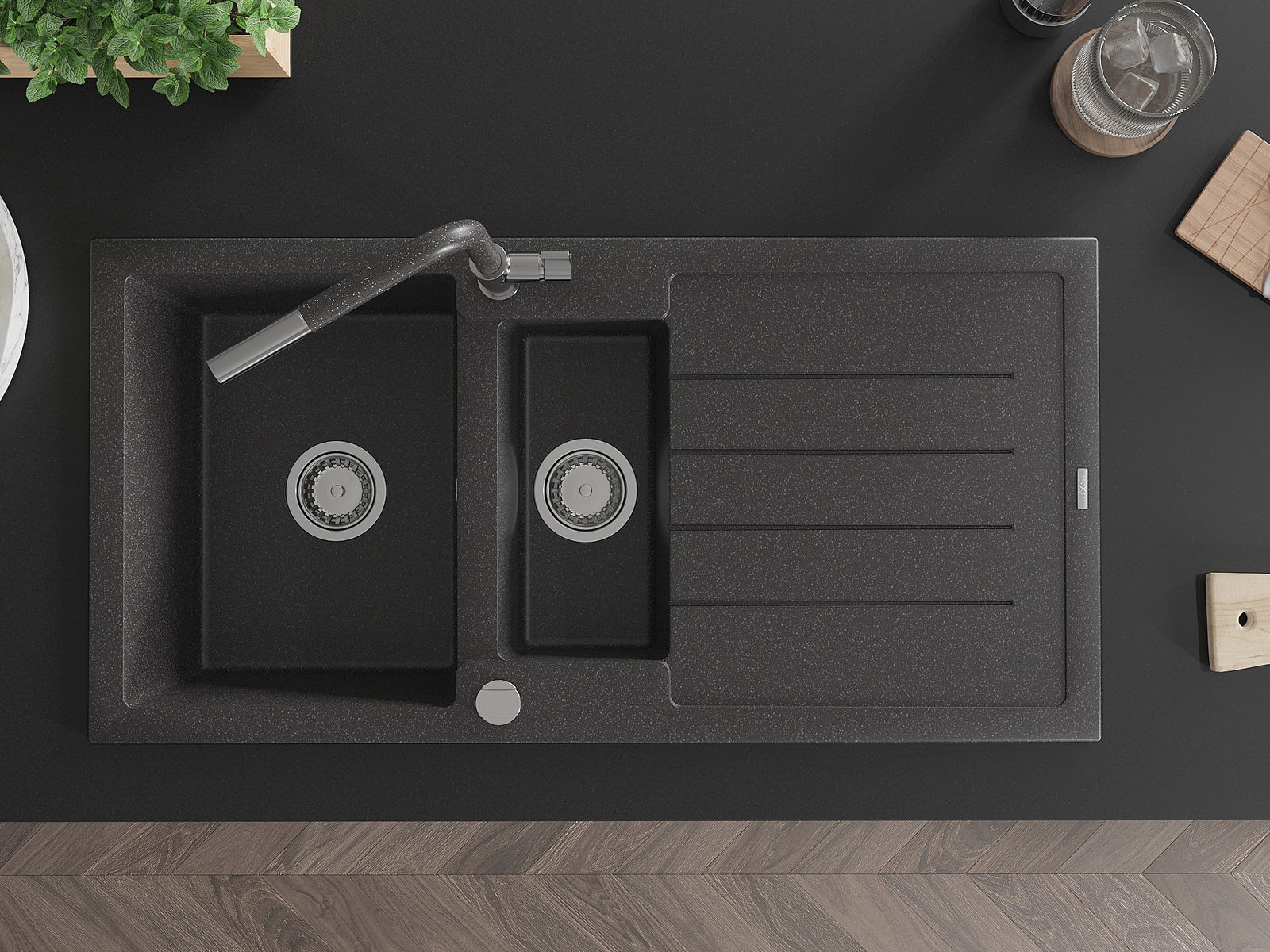 Mexen Andres granitinis 1,5 kamerų plautuvė su nutekėjimu ir virtuviniu maišytuvu Flora, juodas dėmėtas - 6515-76-670401-08