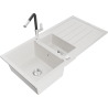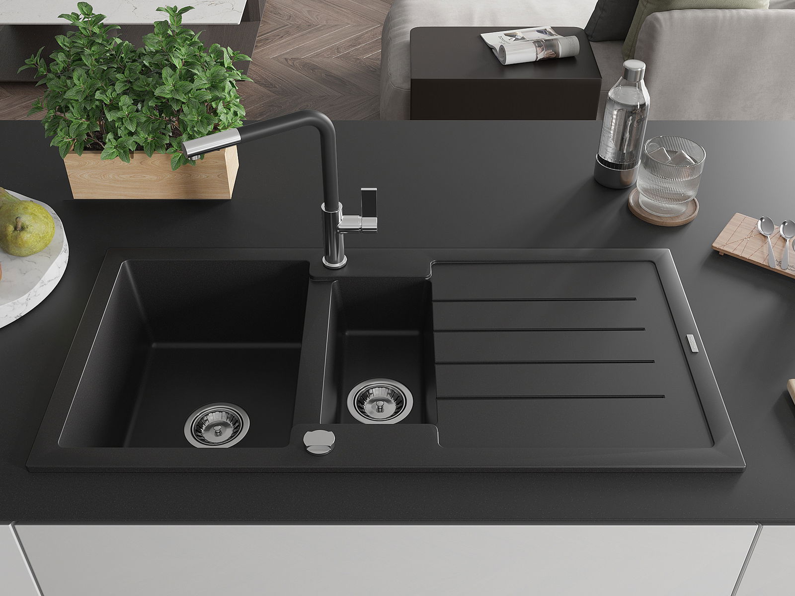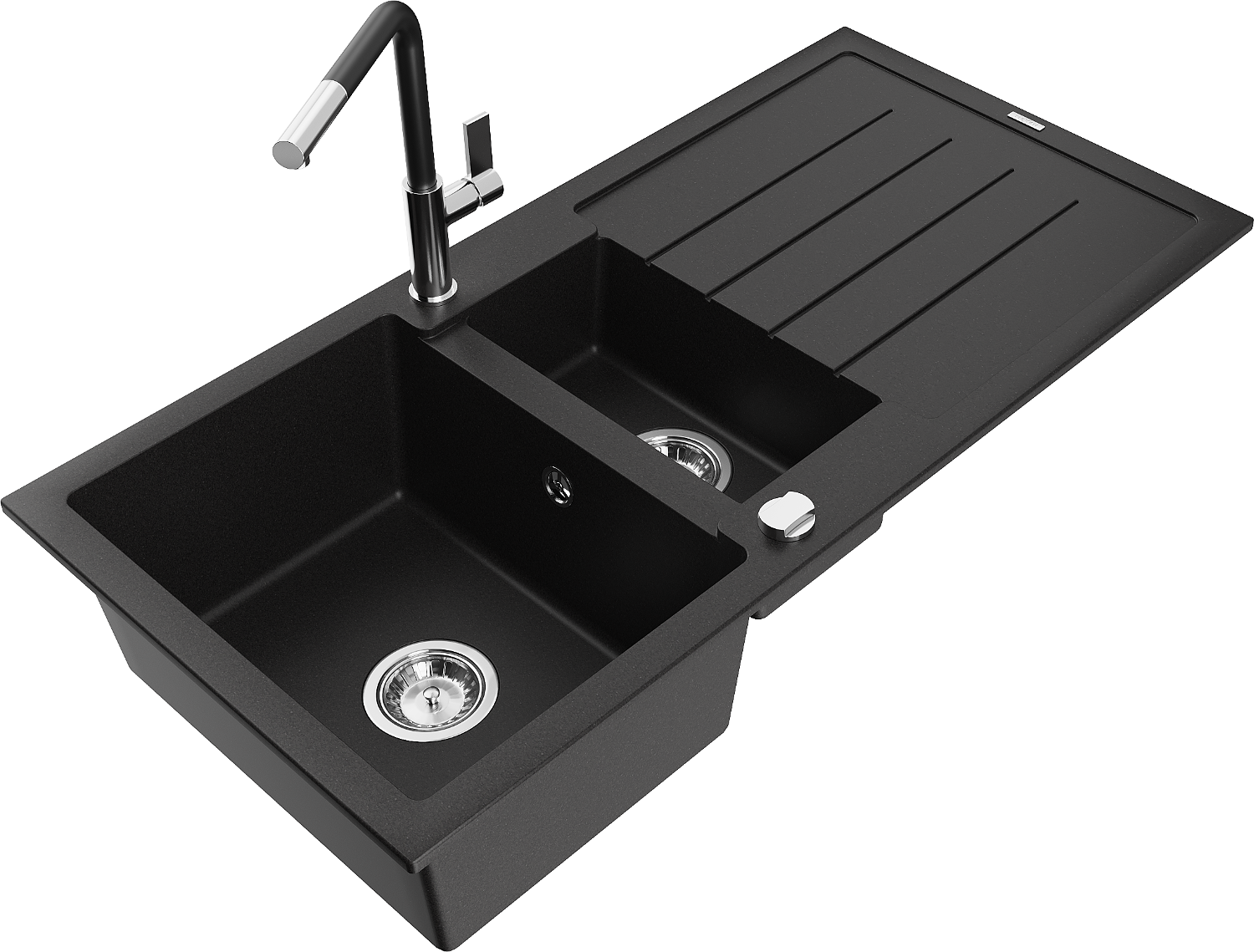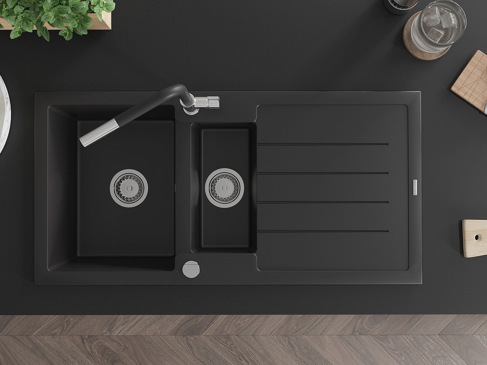 Mexen Andres granito plautuvė 1,5 skyrių su nutekėjimu ir Flora virtuvės maišytuvu, juoda - 6515-77-670401-07