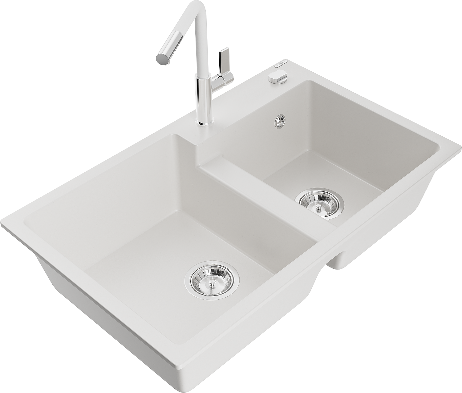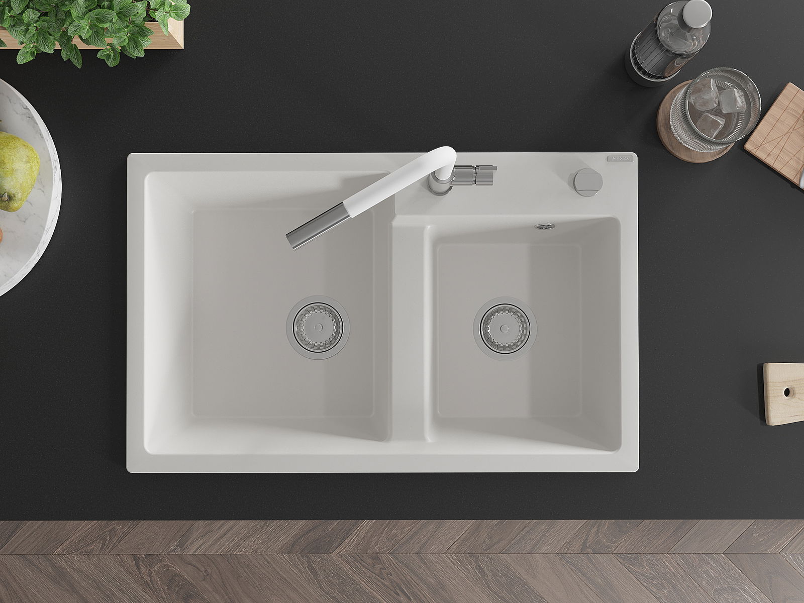 Mexen Tomas granito plautuvė 2 kamerų su virtuviniu maišytuvu Flora, balta - 6516-20-670401-02