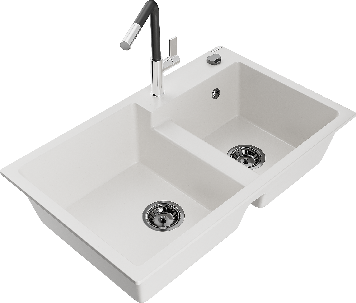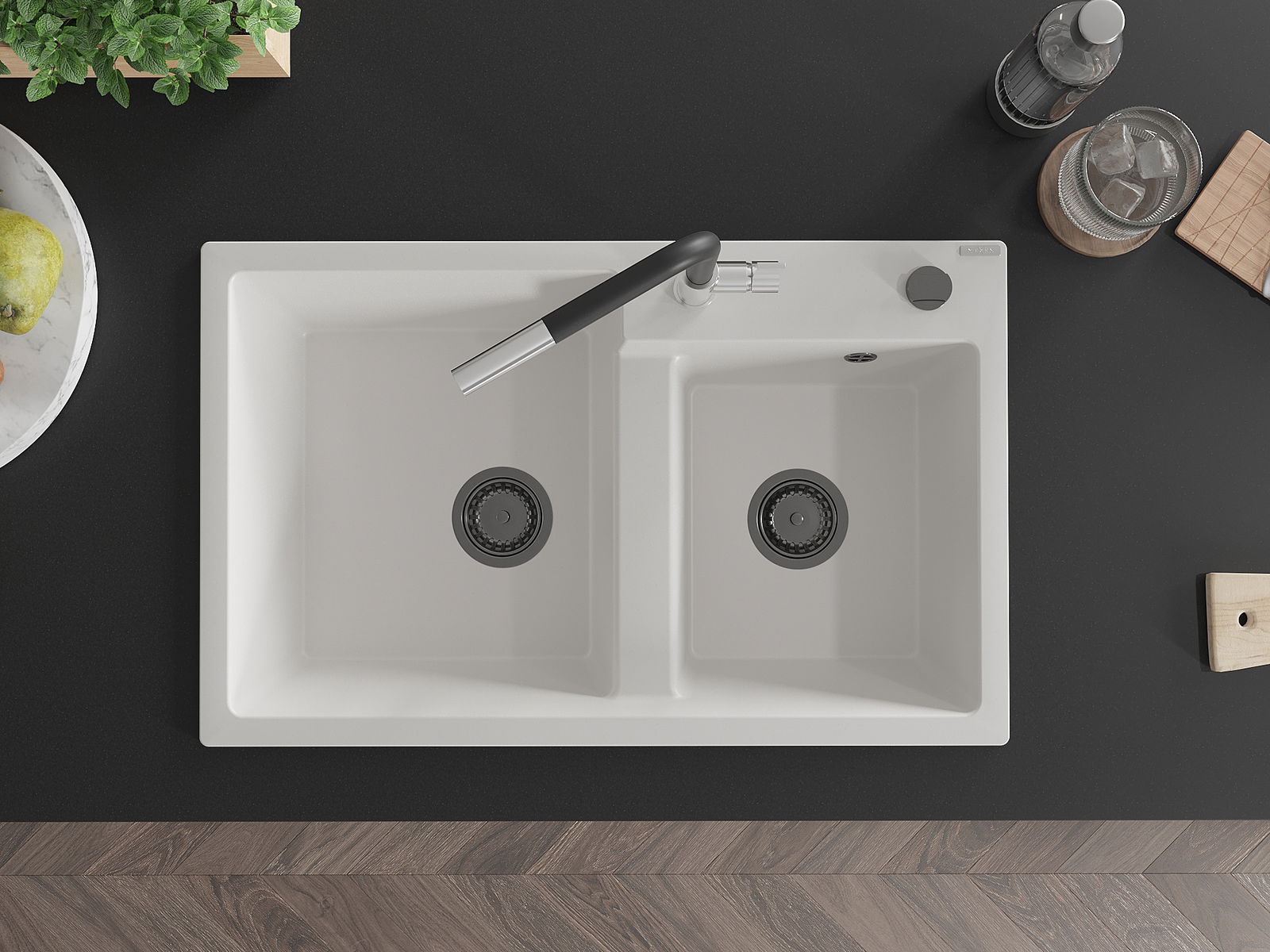 Mexen Tomas granito dviejų kamerų virtuvės plautuvė su Flora maišytuvu, balta - 6516-20-670401-07-B