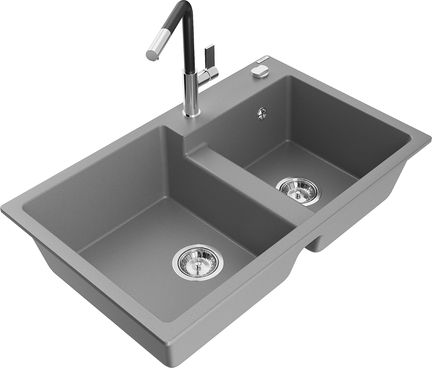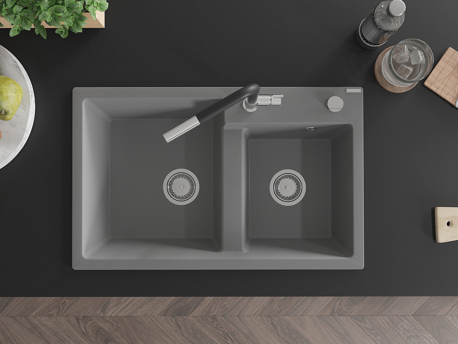 Mexen Tomas granitinė dviejų skyrių plautuvė su virtuviniu maišytuvu Flora, pilka - 6516-71-670401-07
