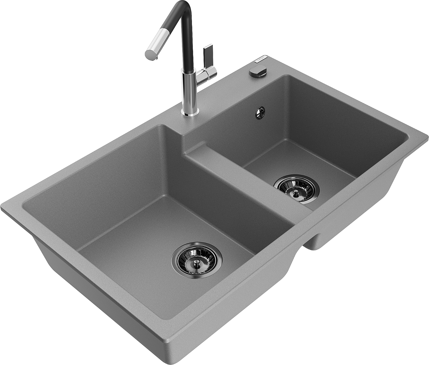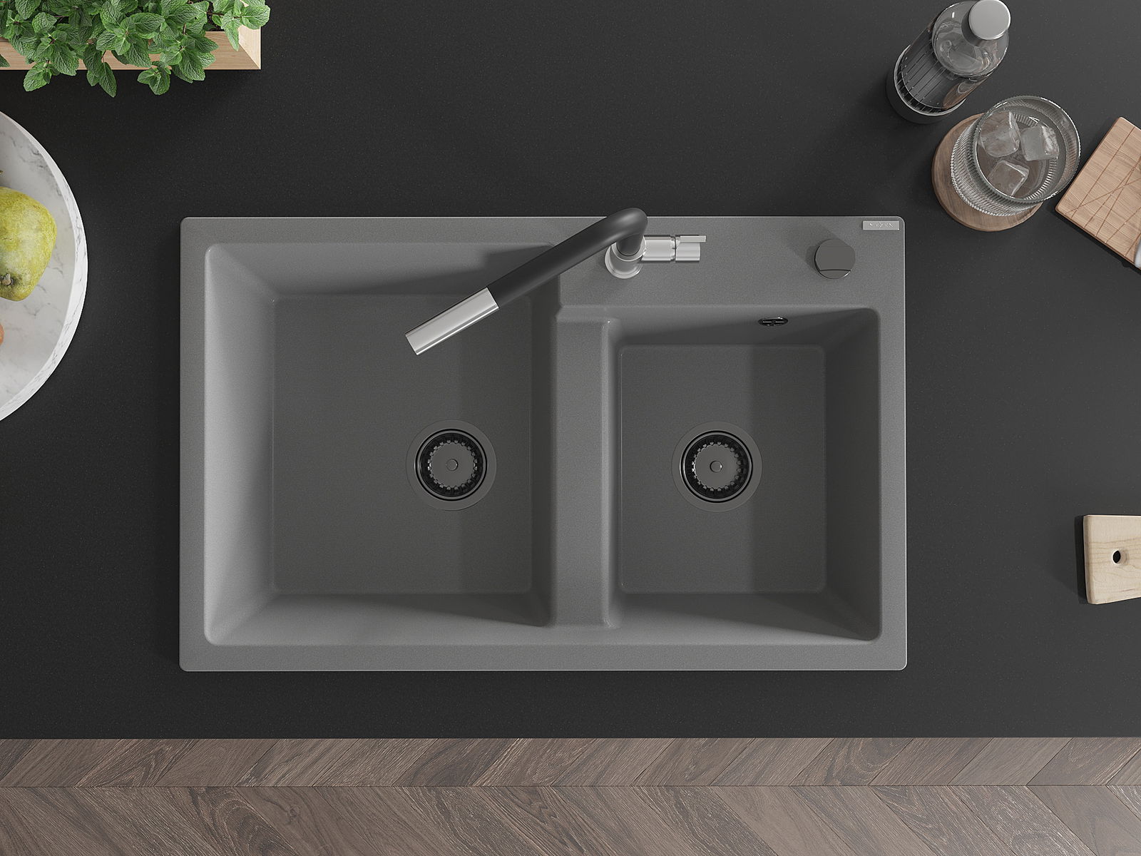 Mexen Tomas granito virtuvės kriauklė su dviem kameromis ir Flora virtuviniu maišytuvu, pilka - 6516-71-670401-07-B