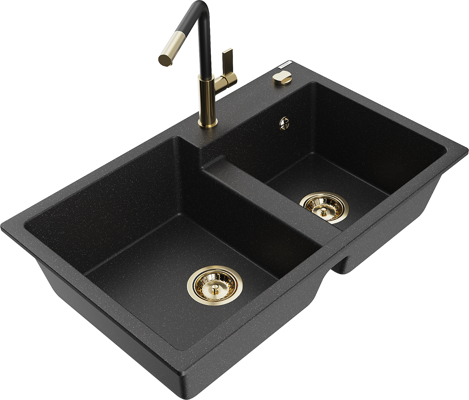 Mexen Tomas granitinė 2 skyrių plautuvė su Flora virtuviniu maišytuvu, juoda/sidabrinė metalo spalvos - 6516-73-670401-57-G