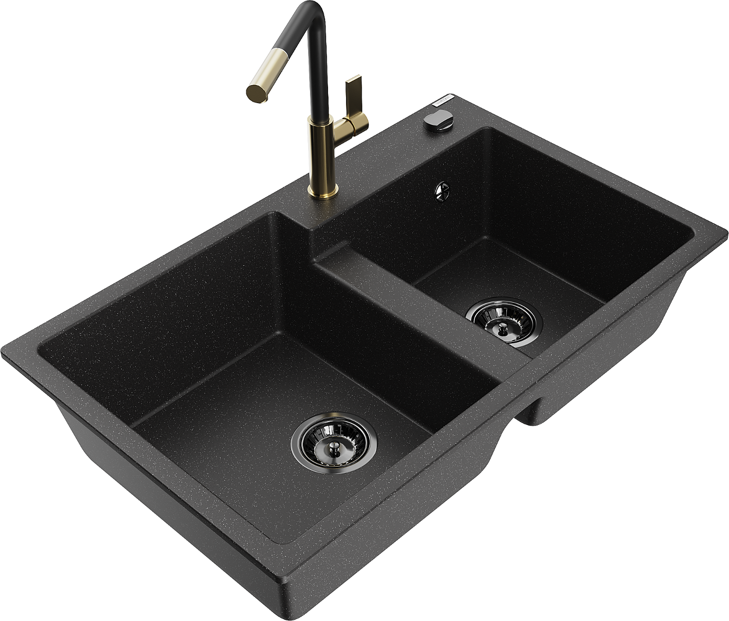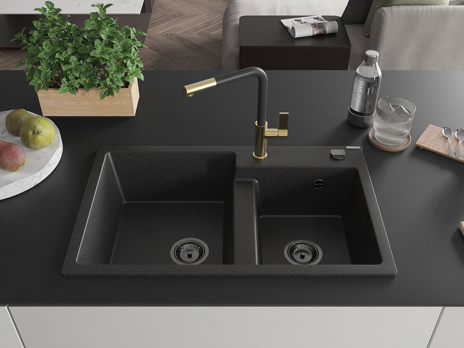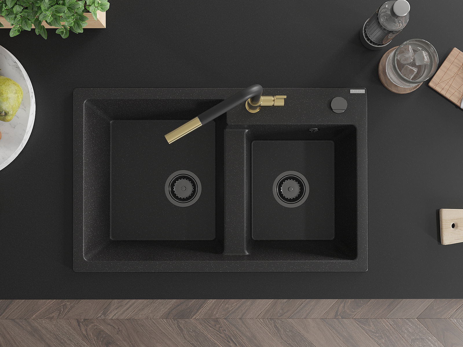 Mexen Tomas granitų plautuvė su 2 skyriais ir virtuviniu maišytuvu Flora, juodas/sidabrinis metalinis - 6516-73-670401-57-B