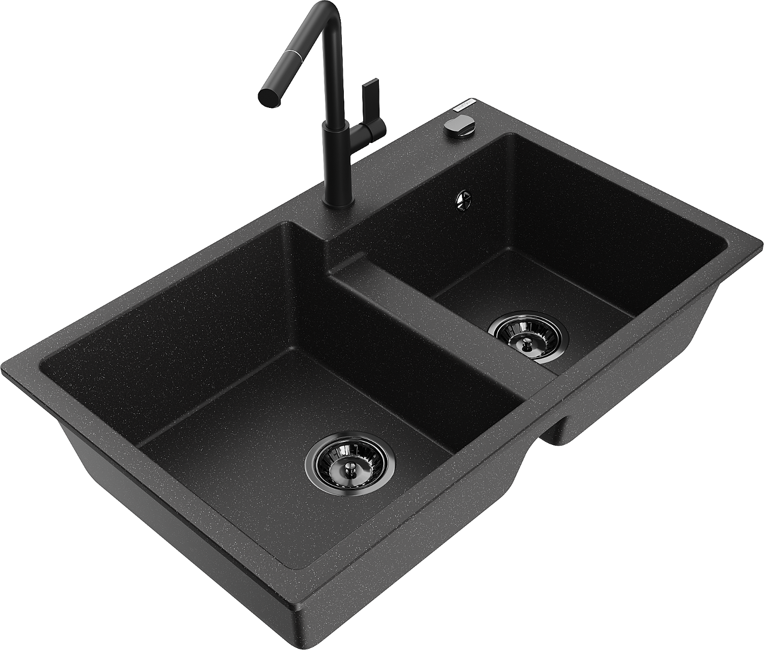 Mexen Tomas granito plautuvė 2-jų skyrių su virtuvės maišytuvu Flora, juodas/sidabrinis metalikas - 6516-73-670401-70-B
