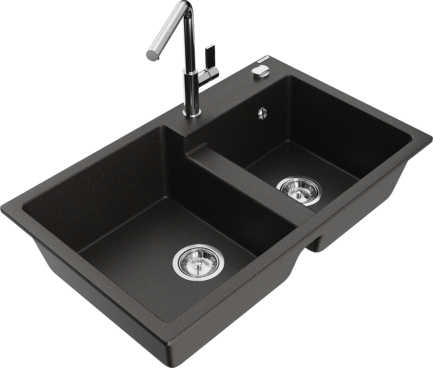 Mexen Tomas granitinis dviejų skylių kriauklė su virtuvės maišytuvu Flora, juoda/auksinė metalo spalva - 6516-75-670401-00