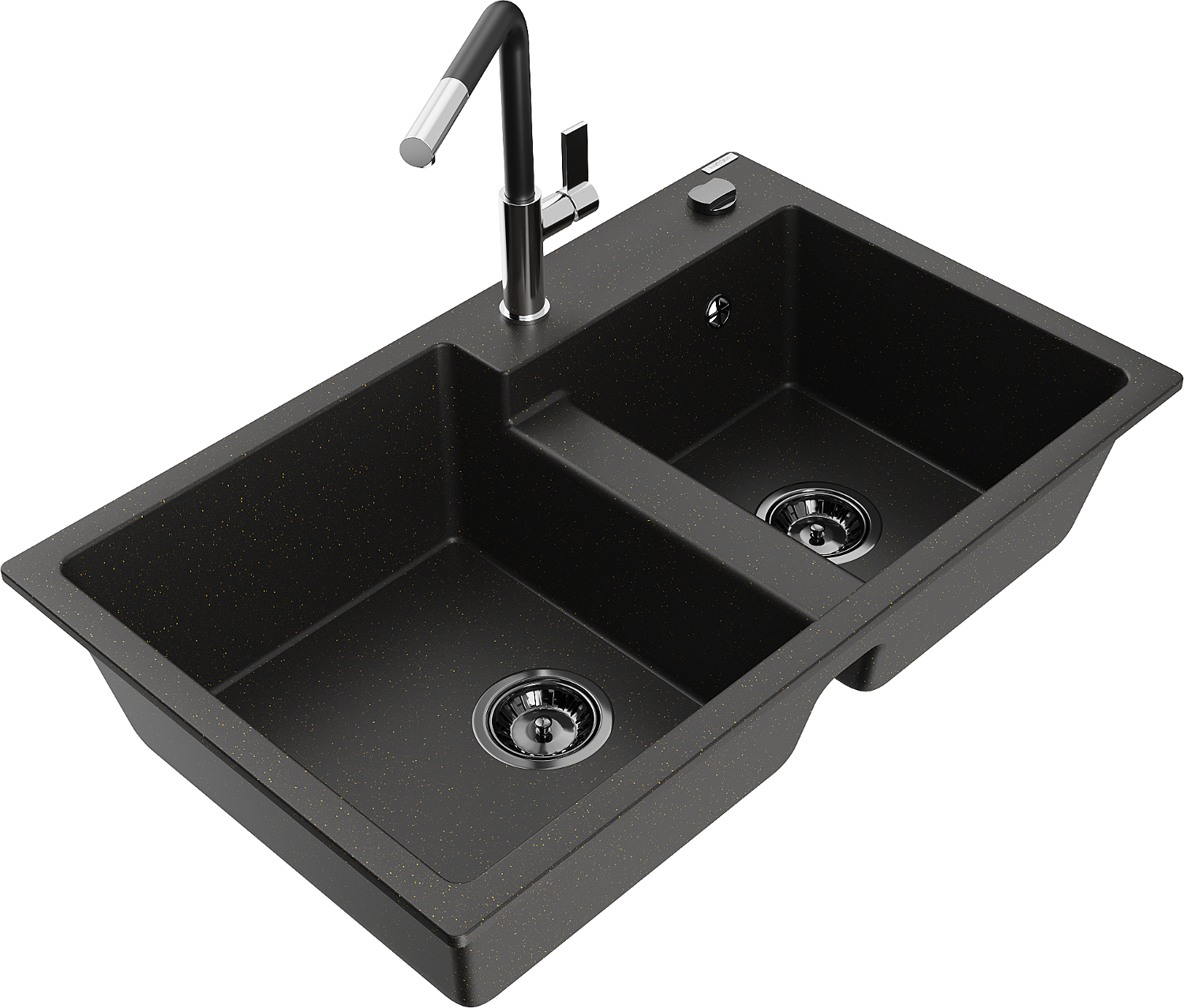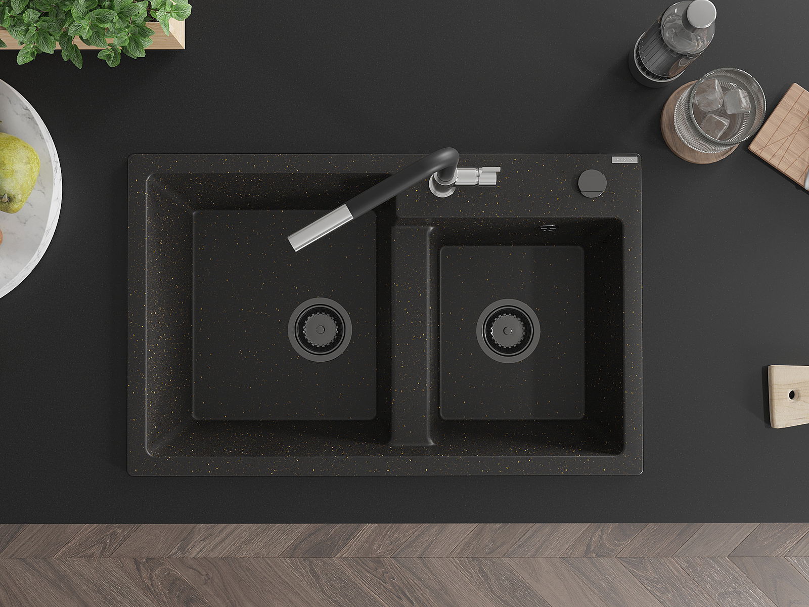 Mexen Tomas granitinė dviejų skyrių kriauklė su virtuviniu Flora maišytuvu, juoda/auksinė metalo spalva - 6516-75-670401-07-B