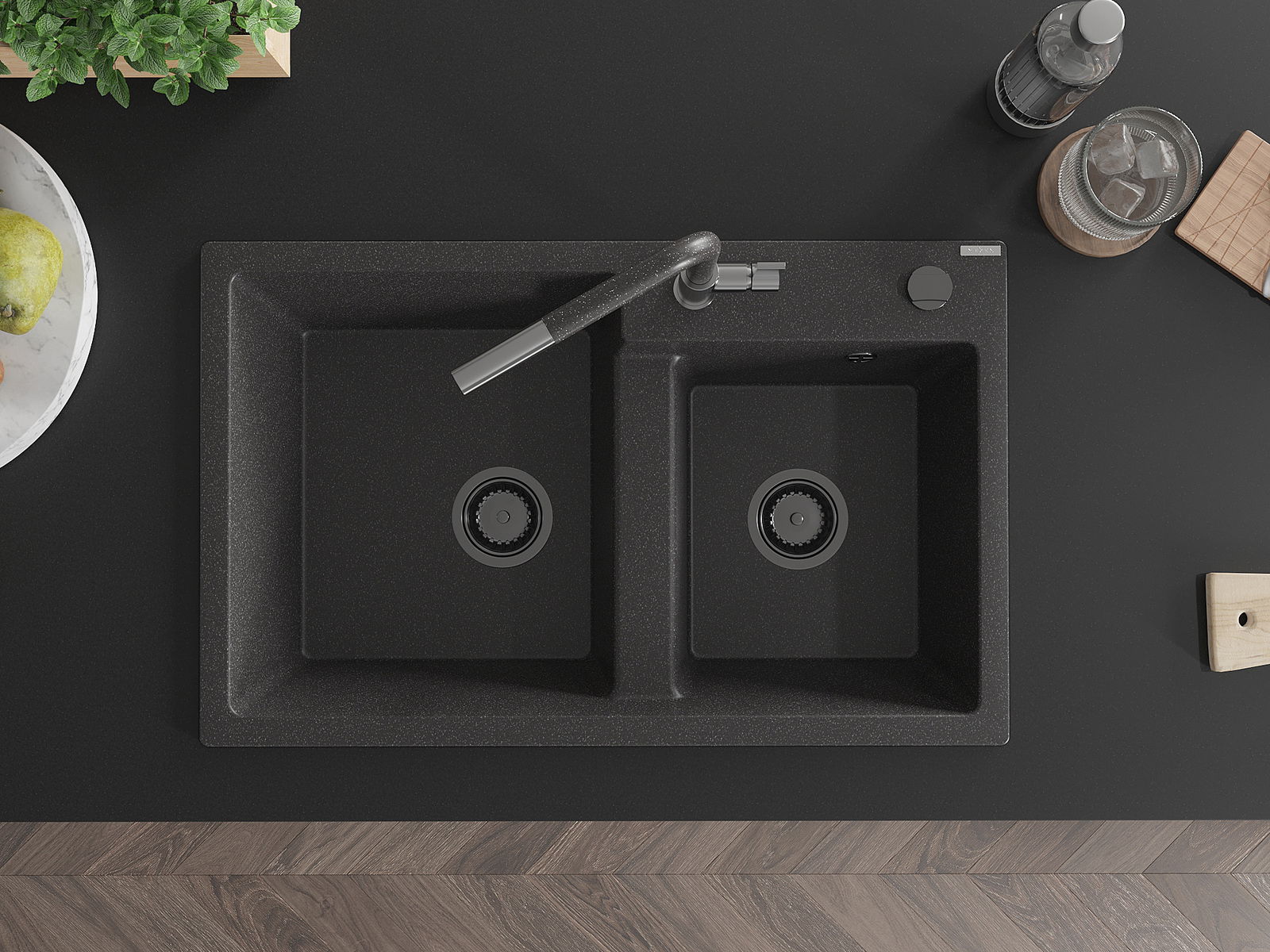 Mexen Tomas granitinė plautuvė 2 skyrių su virtuviniu maišytuvu Flora, juoda dėmėta - 6516-76-670401-08-B