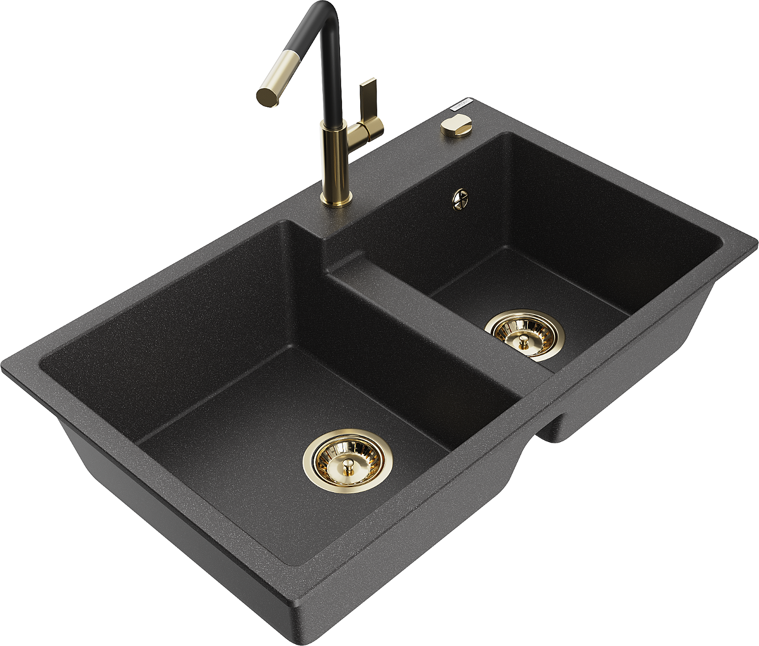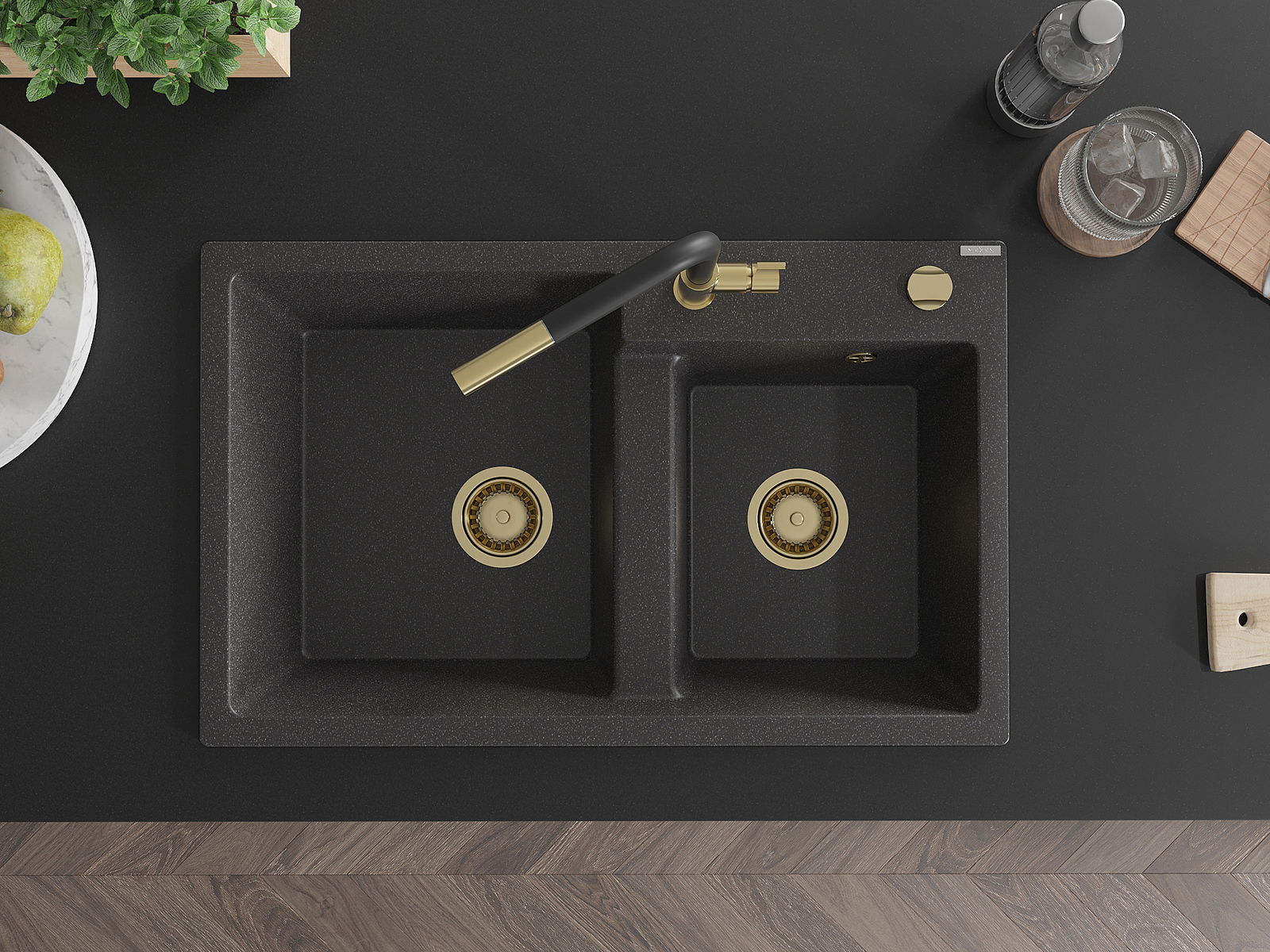 Mexen Tomas granitinis virtuvės plautuvė su dviem kameromis ir Flora virtuvės maišytuvu, juodas dėmėtas - 6516-76-670401-57-G