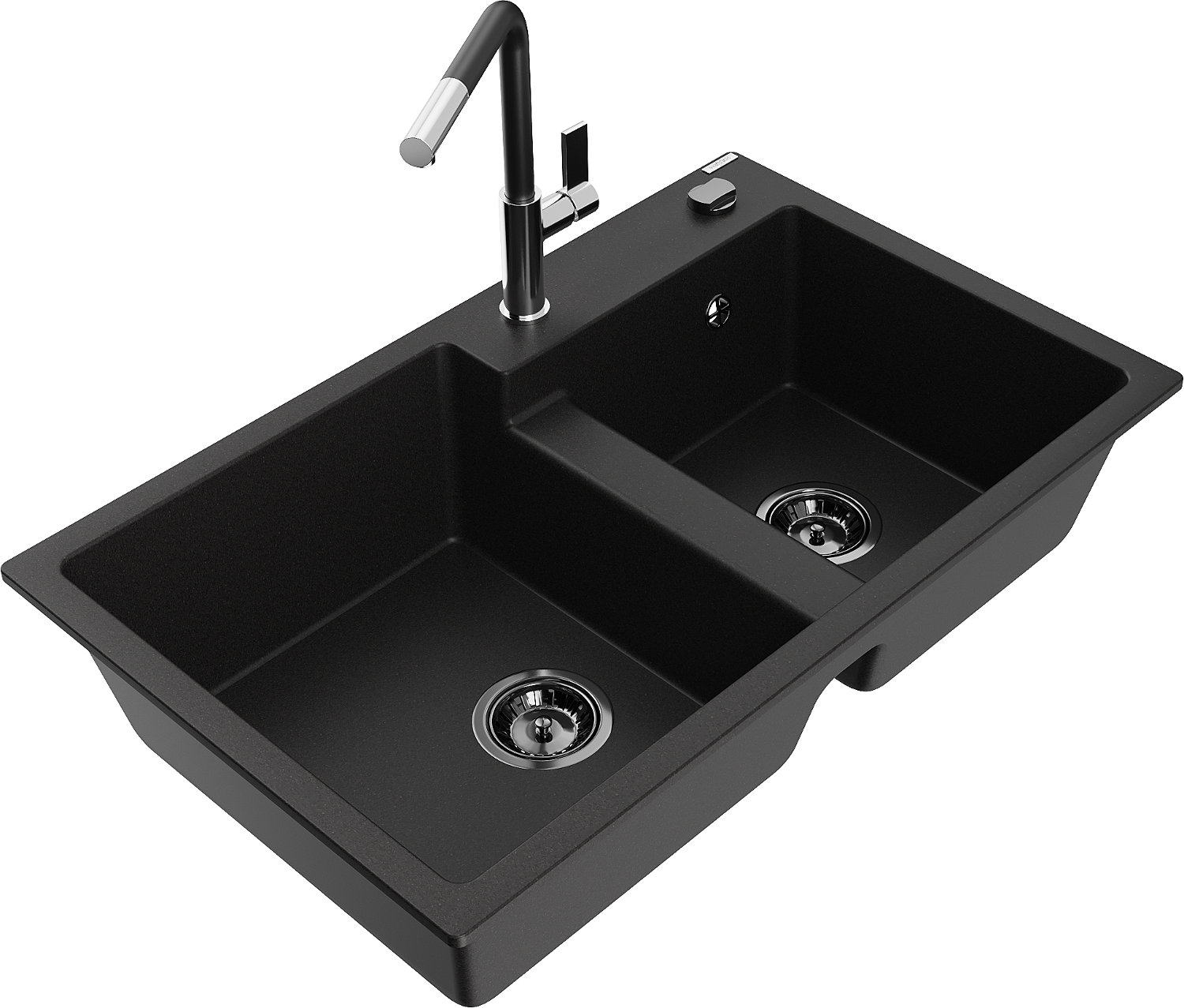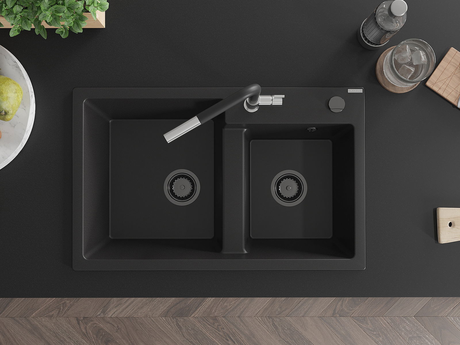 Mexen Tomas granitinė dviejų skyrių plautuvė su virtuviniu maišytuvu Flora, juoda - 6516-77-670401-07-B
