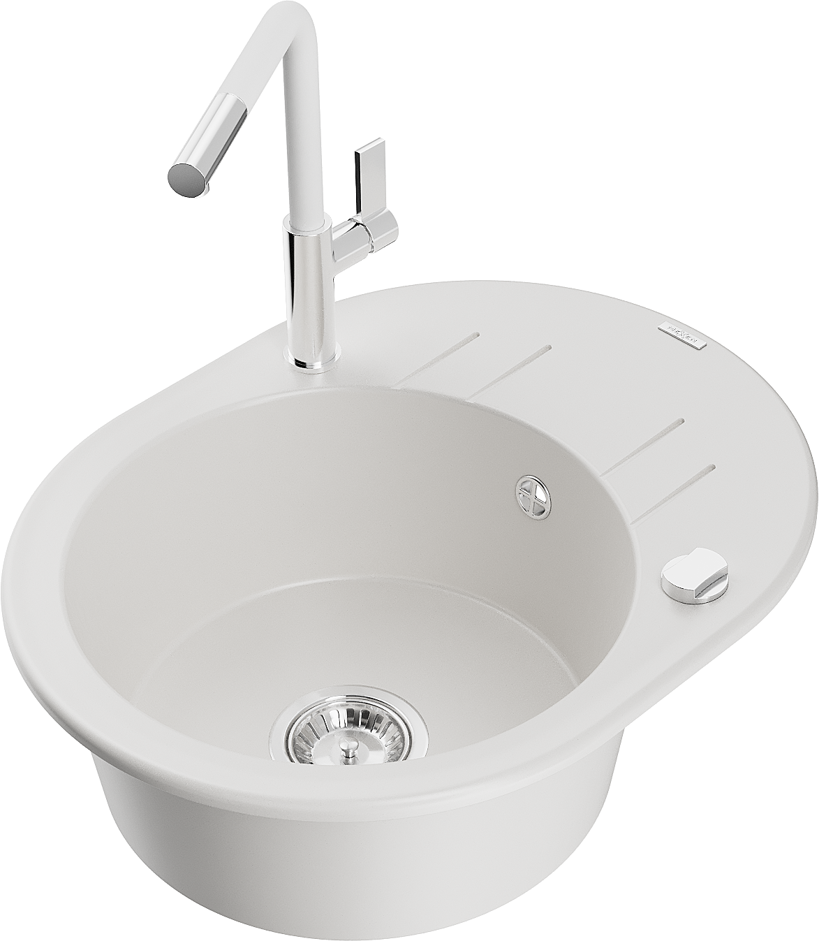 Mexen Kevin granitinė vienos kameros plautuvė su nuvarvėjimo lentynėle ir Flora virtuviniu maišytuvu, balta