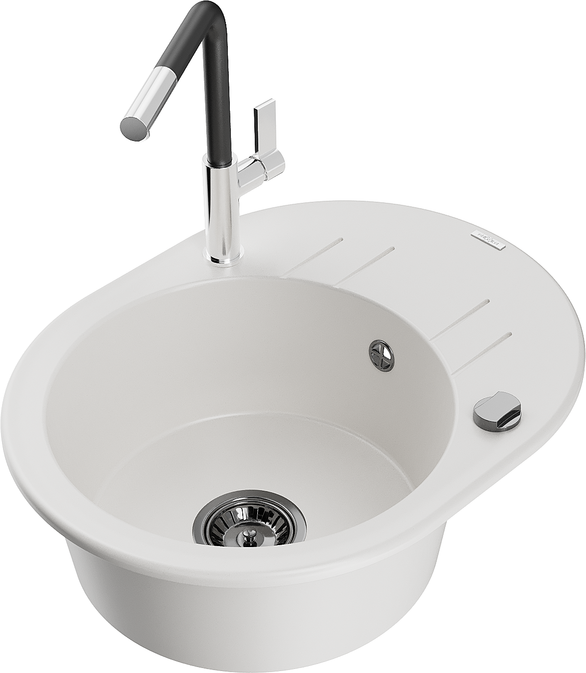 Mexen Kevin granitinis vienos kameros plautuvas su nutekėjimu ir virtuviniu maišytuvu Flora, baltas - 6517-20-670401-07-B