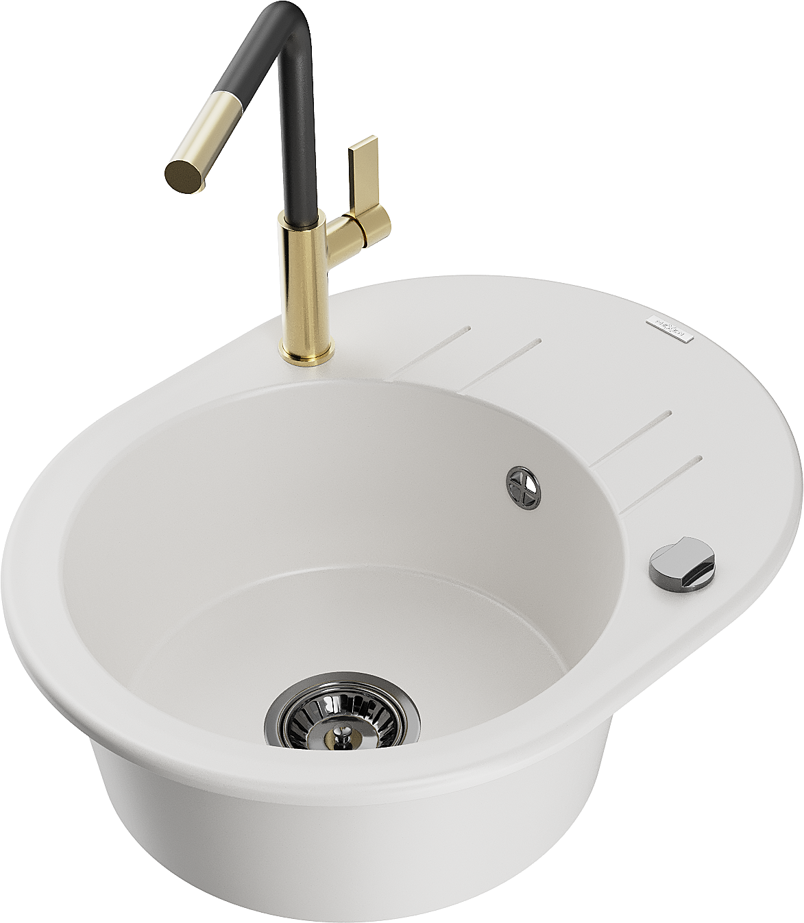 Mexen Kevin vienos kameros granito kriauklė su nusausintuvu ir virtuviniu maišytuvu Flora, balta - 6517-20-670401-57-B