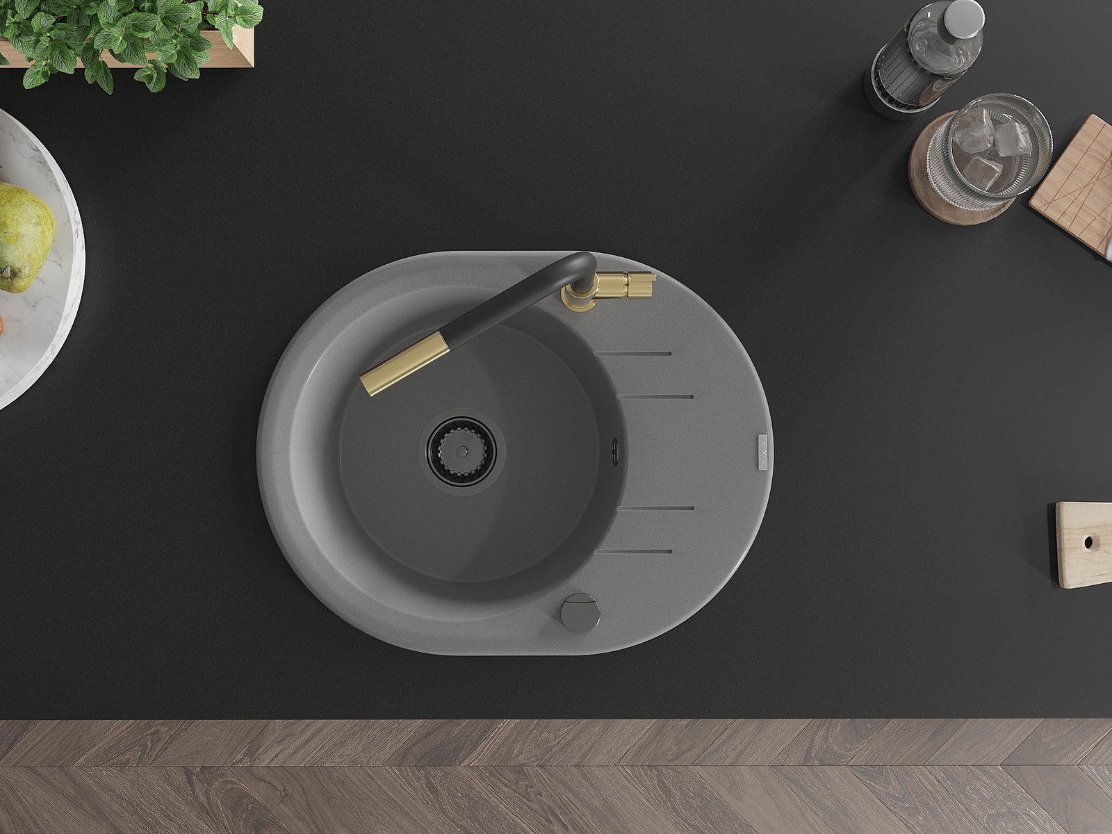 Mexen Kevin granito plautuvė vienos kameros su nusausintoju ir virtuvės maišytuvu Flora, pilkas - 6517-71-670401-57-B