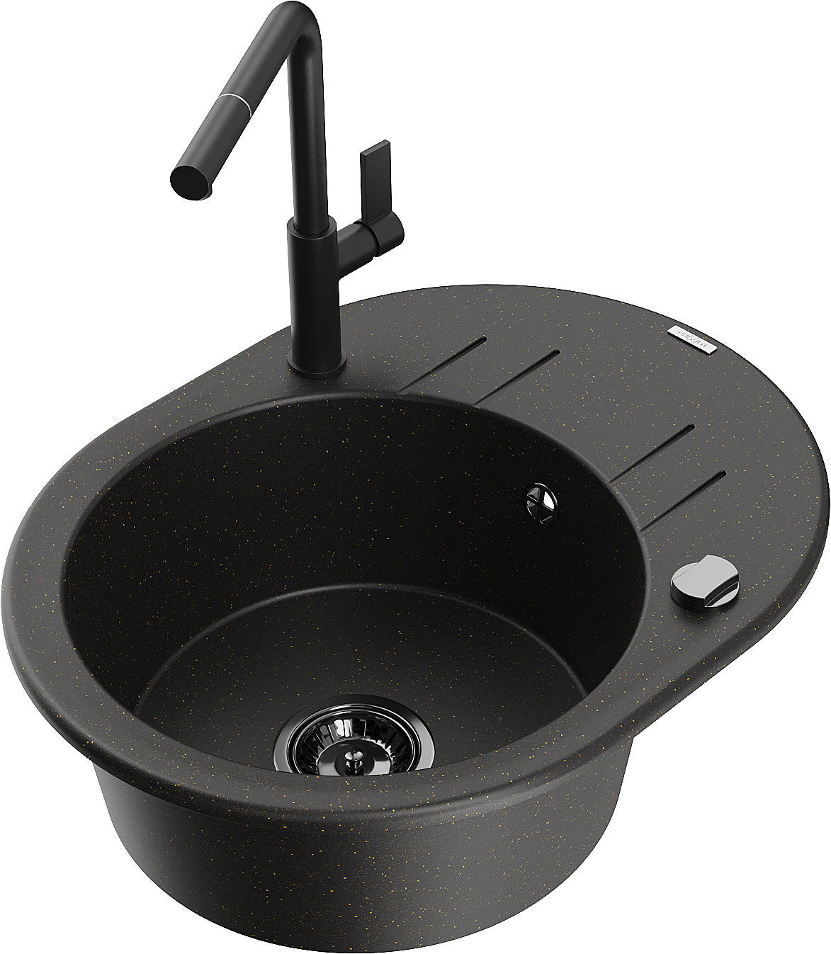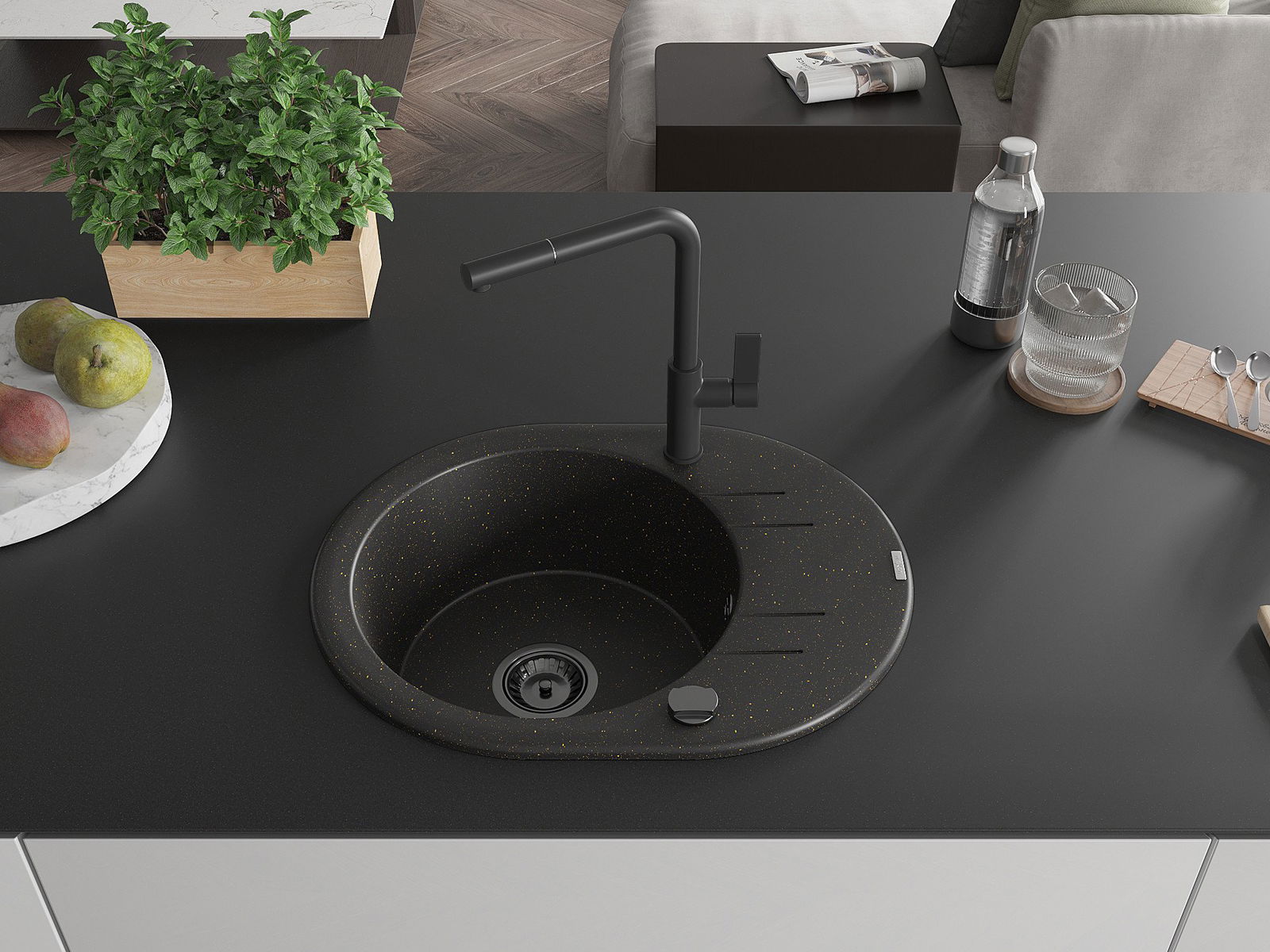 Mexen Kevin granitinė kriauklė su vienu skyriumi, su nusausinimo lentete ir virtuviniu maišytuvu Flora, juoda/auksinis