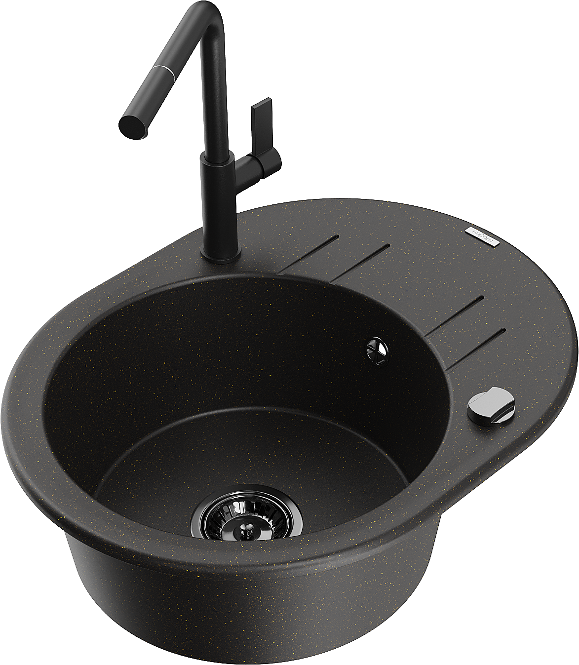 Mexen Kevin granitinis vienos kameros virtuvinis plautuvė su nutekamu ir virtuviniu maišytuvu Flora, juoda/auksinis metalikas -?