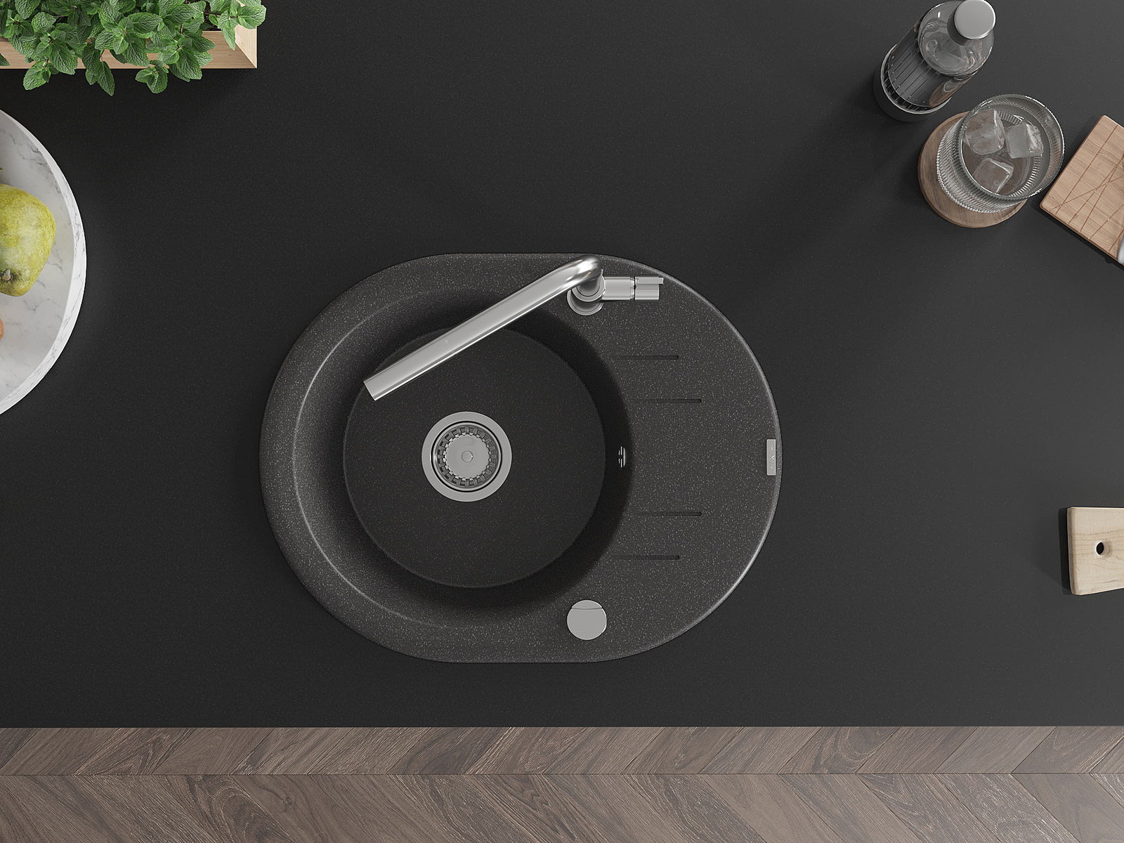 Mexen Kevin granitinė vienos plautuvės kriauklė su nutekamąja skyle ir Flora virtuviniu maišytuvu, juoda su dėmėmis