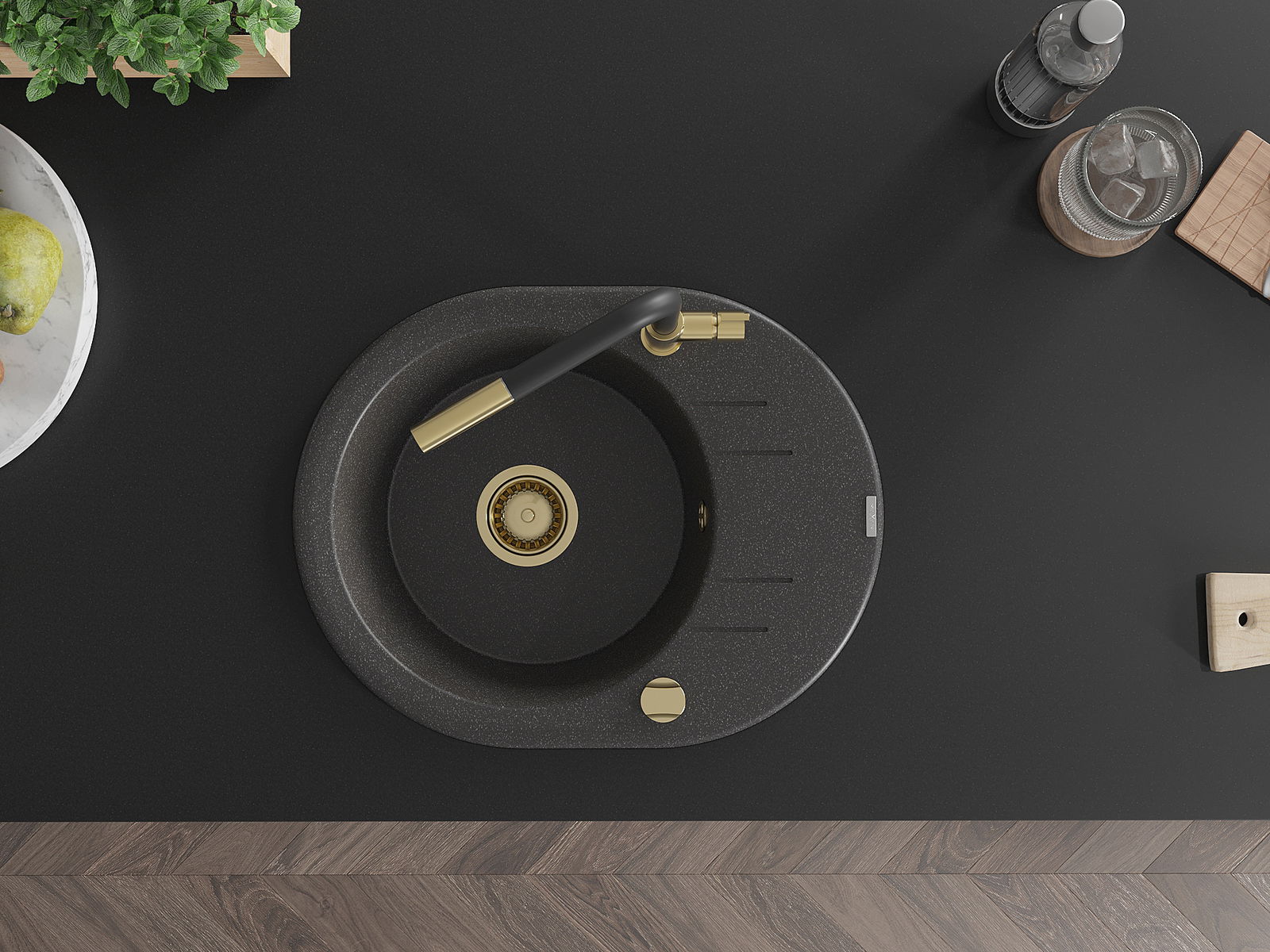 Mexen Kevin granito kriauklė 1-jungtinė su nusausintuvu ir virtuviniu maišytuvu Flora, juoda taškuota - 6517-76-670401-57-G